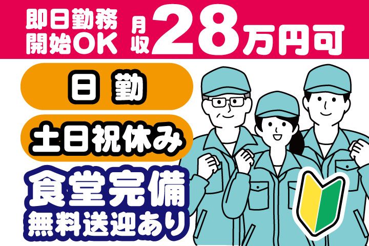 即日勤務OK!駅から無料送迎あり! 日勤&土日祝休みで月収28万円の高収入可能!50代も活躍中!