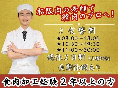 仕事内容 《お仕事の詳細》 明治35年創業の老舗松阪肉料理店にて、 精肉の加工・販売業務をお任せします! 具体的には… ■精肉の加工・下処理 ■贈答用やご自宅用などの商品の販売 ■商品の陳列 ※慣れたら、在庫管理や仕入れもお任せします。 まずはいずれかの工程から挑戦します。 その後、適性や希望を考慮し、 別の工程や部門にチャレンジしていただきます! 作業マニュアルや研修体制も整っていますので、 安心してご応募ください! 《20代・30代・40代のスタッフが活躍中》 当店では、20代・30代・40代の スタッフが中心となって活躍中! ブランクがある方も歓迎します。 ベテランスタッフが イチから丁寧に指導する体制が整っているので 安心して飛び込んで来てくださいね♪ 勤務開始時期は柔軟に調整しますので、 現在お仕事をしている方も お気軽にご相談ください! 《働き方について》 3交代制のシフト勤務を採用しています。 働く時間帯を分けているため、 メリハリをつけて働くことが可能です。 また、月曜定休でプライベートの時間も 確保しやすい環境です。 2月と6月には長期休暇もあり、 リフレッシュしながら 長く働くことができますよ☆ 《待遇・福利厚生について》 安定した待遇・福利厚生で 腰を据えて長く働ける環境です。 ◎賞与・退職金制度あり 日頃の頑張りをしっかりと評価し、還元します。 ◎社会保険完備・時間外手当 安心して働けるよう、各種保険や手当も充実しています。 ◎皆勤手当あり 出勤のモチベーションUPに繋がる皆勤手当も支給しています。