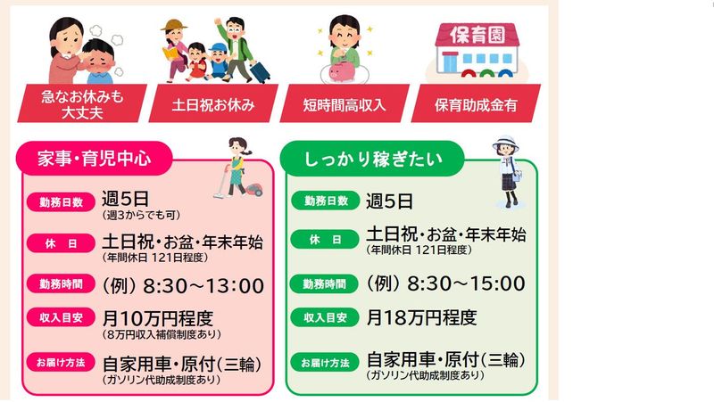 固定時間制 勤務時間詳細 8:30~14:30 (ご希望の収入に応じて変動します) \働き方はあなた次第です♪/ <勤務例> *家事や育児優先のAさん* 勤務日数:週3~5日 勤務時間:8:30~13:00(例) 月収目安:月10万円程度 *しっかり稼ぎたいBさん* 勤務日数:5日 勤務時間:8:30~15:00(例) 月収目安:月18万円程度