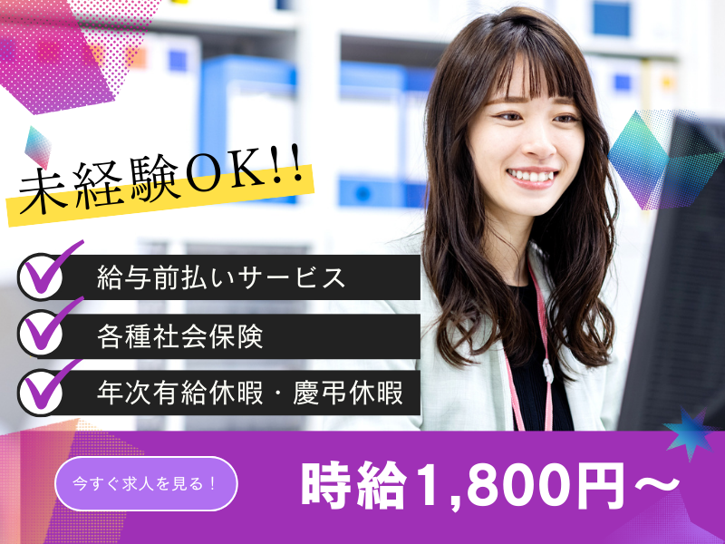 仕事の内容 ★おすすめポイント ◎人気の官公庁系のお仕事で、安定したキャリアを築きませんか? ◎頑張りはしっかり評価!時給1800円の高待遇が魅力です☆ ◎完全週休2日制!土日祝休みでプライベートも充実させられます♪ 【お仕事内容】 人気の官公庁関連の審査業務をお任せします。 【具体的には…】 ・提出された実績報告の審査をお願いします。 ・もし報告内容に不備があれば、事業者の方へお電話で丁寧にご説明し、再申請を促します。 ・担当していただいた案件は、審査完了まで責任を持って進捗管理を行います。 ・事業者の方とのやり取りも、一つ一つ丁寧に進めていただきます。 ・PCの基本操作(Excelでの簡単な計算ができればOK)と、電話・メール対応ができれば活躍できます! 【職場環境/その他】 \安心の勤務地/ 東京都千代田区、大手町駅直結というアクセス抜群のオフィスです! 通勤もラクラクですね☆ \快適なオフィスライフ/ オフィスカジュアルでのお仕事です。幅広い年齢層の方が活躍されており、特に女性が多く、和気あいあいとした雰囲気ですよ♪ 感染症対策も万全で、マスク着用をお願いしていますが、快適に働ける環境が整っています。 休憩室やロッカーも完備! \長期安定をお考えの方へ/ 平日週5日、9:00~17:30(休憩60分)の勤務時間です。 残業は月20~30h程度を想定していますが、その分もしっかり稼げます! 長期安定して働きたい方にピッタリのお仕事です。ぜひご応募ください!♪