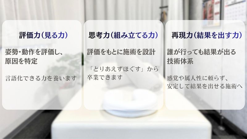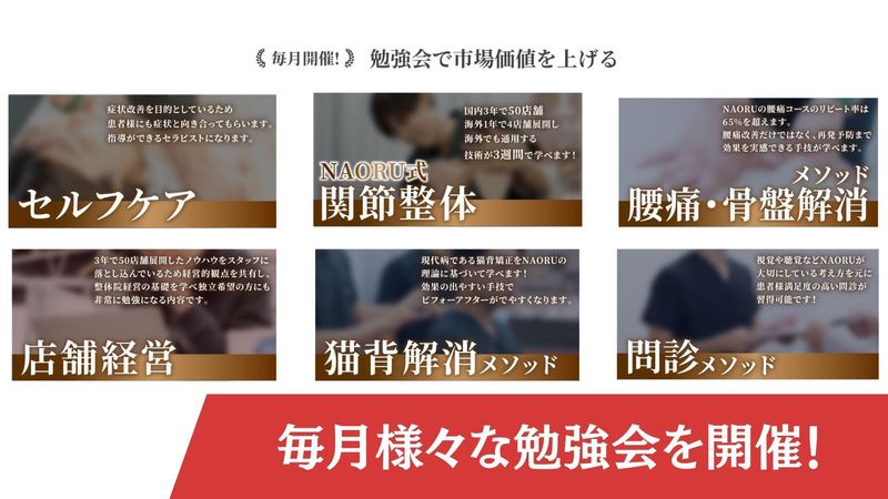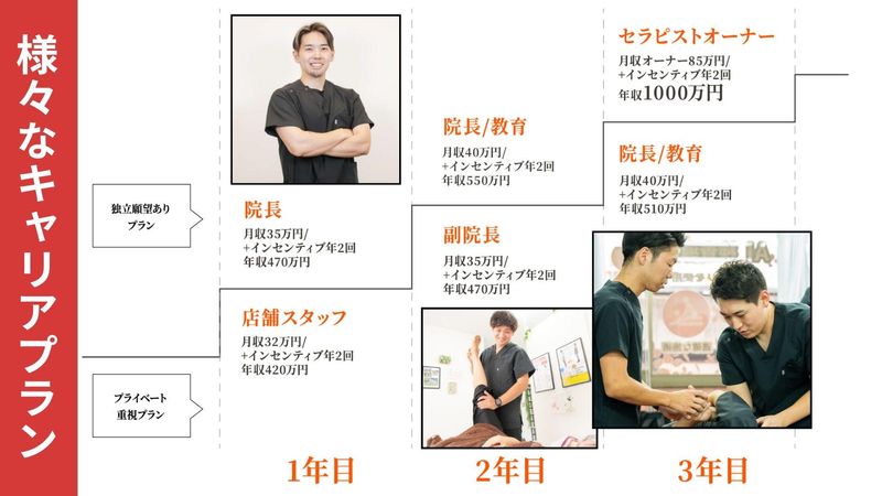 求めている人材 以下いずれかの 国家資格をお持ちの方、歓迎! ・柔道整復師 ・理学療法士 ・作業療法士 ・鍼灸師 ・あん摩マッサージ指圧師 <以下のような方に向いています> ・患者様としっかり向き合いたい方 ・本当に治せる整体師を目指したい方 ・感覚ではなく理論を学びたい方 ・成長できる環境で働きたい方 ・将来のキャリアも考えたい方