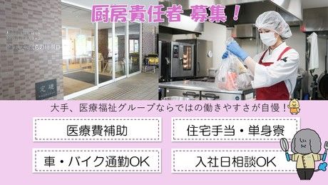 仕事内容 【業務内容】埼玉県川口市/特別養護老人ホームでの厨房責任者業務をおまかせします! ・盛付け ・配膳、下膳 ・機材での食器類の洗浄など ・スタッフマネジメント業務(教育、指導、シフト作成など) ・報告書作成など事務業務 ・本部、施設管理者との連携、調整業務 ☆管理栄養士さんと協力して入居者様、職員に美味しい食事を提供してください。 ※介護業務無し 【応募要件】厨房メンバーをまとめるマネジメントスキルのある方のご応募お待ちしております。 <必須> ・厨房業務経験 ・給食業態や集団調理の経験がある方 <歓迎> ・クックチルシステムでの厨房業務経験者 ・給食施設や飲食店での厨房管理業務経験者 【タムスさくらの杜川口について】 2011年にオープンしたユニット型特別養護老人ホームです。 ・定員:入所140名 ・居室:個室140室(10室×14ユニット) 近隣にはタムスさくら病院川口、タムス介護医療院川口があり、医療的なサポート体制も抜群です。 【待遇・福利厚生】長く勤務いただくための制度をご用意しています! 通勤交通費支給 昇給 賞与(選択制) 退職金制度 再雇用制度/65歳まで(定年60歳:例外事由1号) 住宅手当(上限3万円) 社食あり(1食350円) 制服貸与 単身寮 産休育休 社保完備 医療費補助制度 ハラスメント相談窓口 従業員向けメンタルヘルス窓口 Amazonビジネス割引 ※各項目規定あり