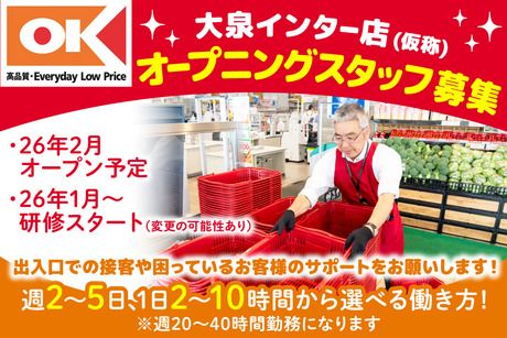 仕事内容 【 お仕事内容 】 ★裏方から店舗を支える仕事 ★黙々作業が得意な方はぜひ! ★ほどよく体を動かせます◎ \\2026年2月 NEWオープン!// 新しくオープンするスーパーで 立ち上げメンバーを募集します♪ ◆募集人数はなんと170名! ◆しっかり学べる研修制度あり◎ ――――――――――――― こんなことをお任せします! ――――――――――――― 単なる「回収業務」ではありません! お客様へのサポートを 大切にしているポジションです◎ ■お客様のサポート ・売り場のご案内 ・レジ後の荷物運びのお手伝い ・カートやベビーカーの操作サポート など、「ありがとう」がもらえる やりがいのある仕事です! ■カート・カゴの回収(駐車場含む) 駐車場や店内に置かれている カート・カゴを回収し、 使いやすいように整える業務もお願いします。 【 オーケーの魅力♪ 】 ◆仕事終わりにそのまま買い物できる 勤務先がスーパーだから、 作業を終えた流れでそのまま買い物も完了。 効率よく日用品を揃えられ、 毎日の生活もスムーズに整います。 ◆しっかりした研修&サポート体制 未経験スタートでも安心。 道具の扱い方や店舗ルールは、 丁寧な研修でイチから学べます。 分からないこともすぐに聞ける環境で、 落ち着いて仕事に慣れていけます。 ■ゆとりある人員配置で安心 1店舗あたり社員さんが22~23名いるので わからないこともすぐに相談できて安心♪ 業界的にも社員数が多い職場だから、 とっても心強いですよ! 【 しっかりした研修あり 】 \\2026年1月から研修スタート!// 新店オープンに向けて、 しっかり準備ができる体制が整っています! <事前研修あり> ・他店舗での“お試し勤務”で現場を体感! ・合同研修で仲間と一緒に学べる♪ ⇒既存店舗で、仕事のやり方やルールまわりなど 基礎から実践までじっくり身につけられます! < オープン後のサポートも充実> ・経験豊富な社員がしっかりサポート! ・分からないことも、すぐに聞ける環境◎ ⇒オープン初日から1人にさせない安心の職場です♪ 【 大泉インター店へのアクセス詳細 】 <バスの場合> 国際興業バス「比丘尼橋」下車、徒歩1分 ・地下鉄成増駅から乗車の場合 「成増駅南口」バス停から14分 ※平日は1時間に5本~6本 休日は1時間に4本~5本 ・石神井公園駅から乗車の場合 「石神井公園駅北口」バス停から15分 ※平日は1時間に4本~6本 休日は1時間に3本~5本 <徒歩の場合> 西武池袋線「大泉学園駅」から徒歩25分! 西武池袋線「大泉学園駅」北口を出て グランエミオさん手前のエスカレーターを降ります。 そのまま東急リバブルさん方面へ直進し、 交差点を右に渡ります。 靴流通センターさんを通り過ぎ、1つ目の路地を左折。 すぐに右折し、道なりに進むとT・ジョイさんが見えてきます。 T・ジョイさんを過ぎ直進し 大通りに出ると左手にお店があります。 ※自転車通勤応相談 【 勤務形態について 】 この求人はパートナー社員の募集です! パートナー社員とは? 週20時間以上働く勤務形態です。 社会保険に加入でき、週40時間のフルタイム勤務など 契約社員のような働き方も可能です。 ※パートナー社員以外には アシスタントパートナー社員という働き方もあります。 アルバイト・パートとして、週20時間未満で働く 扶養内勤務可能な勤務形態です。