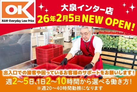 仕事内容 【 お仕事内容 】 ★裏方から店舗を支える仕事 ★ほどよく体を動かせます◎ \\2026年2月 NEWオープン!// 新しくオープンするスーパーで 立ち上げメンバーを募集します♪ ◆募集人数はなんと170名! ◆しっかり学べる研修制度あり◎ ――――――――――――― こんなことをお任せします! ――――――――――――― 単なる「回収業務」ではありません! お客様へのサポートを 大切にしているポジションです◎ ■お客様のサポート ・売り場のご案内 ・レジ後の荷物運びのお手伝い ・カートやベビーカーの操作サポート など、「ありがとう」がもらえる やりがいのある仕事です! ■カート・カゴの回収(駐車場含む) 駐車場や店内に置かれている カート・カゴを回収し、 使いやすいように整える業務もお願いします。 【 オーケーの魅力♪ 】 ◆仕事終わりにそのまま買い物できる 勤務先がスーパーだから、 作業を終えた流れでそのまま買い物も完了。 効率よく日用品を揃えられ、 毎日の生活もスムーズに整います。 ◆しっかりした研修&サポート体制 未経験スタートでも安心。 道具の扱い方や店舗ルールは、 丁寧な研修でイチから学べます。 分からないこともすぐに聞ける環境で、 落ち着いて仕事に慣れていけます。 ■ゆとりある人員配置で安心 1店舗あたり社員さんが18~19名いるので わからないこともすぐに相談できて安心♪ 業界的にも社員数が多い職場だから、 とっても心強いですよ! 【 しっかりした研修あり 】 仕事のやり方やルールなど 基礎から実践までじっくり身につけられます! ・経験豊富な社員がしっかりサポート! ・分からないことも、すぐに聞ける環境◎ ⇒勤務初日から1人にさせない安心の職場です♪ 【 大泉インター店へのアクセス詳細 】 <バスの場合> 国際興業バス「比丘尼橋」下車、徒歩1分 ・地下鉄成増駅から乗車の場合 「成増駅南口」バス停から14分 ※平日は1時間に5本~6本 休日は1時間に4本~5本 ・石神井公園駅から乗車の場合 「石神井公園駅北口」バス停から15分 ※平日は1時間に4本~6本 休日は1時間に3本~5本 <徒歩の場合> 西武池袋線「大泉学園駅」から徒歩25分! 西武池袋線「大泉学園駅」北口を出て グランエミオさん手前のエスカレーターを降ります。 そのまま東急リバブルさん方面へ直進し、 交差点を右に渡ります。 靴流通センターさんを通り過ぎ、1つ目の路地を左折。 すぐに右折し、道なりに進むとT・ジョイさんが見えてきます。 T・ジョイさんを過ぎ直進し 大通りに出ると左手にお店があります。 ※自転車通勤応相談 【 勤務形態について 】 この求人はパートナー社員の募集です! パートナー社員とは? 週20時間以上働く勤務形態です。 社会保険に加入でき、週40時間のフルタイム勤務など しっかり稼ぐ働き方も可能です。