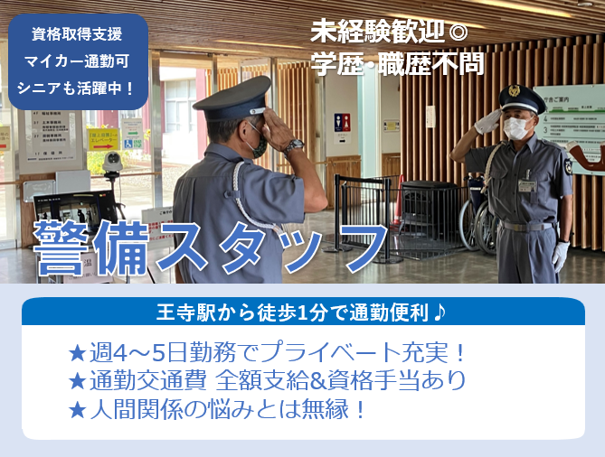 求めている人材 未経験の方歓迎! 職歴・学歴も不問です★ |◤ 歓迎条件 ◢|  ̄ ̄ ̄ ̄ ̄ ̄ ̄ ̄ ◇警備経験者歓迎 |◤ こんな方にオススメ ◢|  ̄ ̄ ̄ ̄ ̄ ̄ ̄ ̄ ̄ ̄ ̄ ̄ ◇仕事に誠実に取り組める方 ◇安定した職場環境を求めている方 ◇チームワークを大切にできる方 【下記、経験者は即戦力】 ・交通誘導・交通整備の経験をお持ちの方 ・施設警備員、大学警備、夜間警備パートの経験をお持ちの方 ・大学警備・守衛経験の経験をお持ちの方 ・警備員、常駐警備、セキュリティスタッフの経験をお持ちの方 ・オフィスビル・商業施設での巡回・パトロールの経験をお持ちの方 ・ガードマン、イベント警備の経験をお持ちの方 ・駐車場受付、工事現場警備の経験をお持ちの方 ・雑踏警備/交通誘導警備/施設警備業務検定の資格をお持ちの方 ・カートスタッフ、駐車場管理の経験をお持ちの方 ・プール監視員、安全管理業務、モニター監視の経験をお持ちの方 ・出入り口管理・店舗巡回の経験をお持ちの方 ・ショッピングセンター・スーパーでの店内警備の経験をお持ちの方 ・商業施設・ショッピングモールでの警備の経験をお持ちの方 ・夜間アルバイト・深夜夜勤アルバイトの経験をお持ちの方 ・宿直員、巡回スタッフの経験をお持ちの方 ・搬出・搬入口管理の経験をお持ちの方 ・ビル設備管理、ビルメンテナンス、清掃、管理人の経験をお持ちの方 ・単発警備アルバイト・短期警備アルバイトのご経験をお持ちの方 <今いるスタッフの前職は・・・> スーパースタッフ、惣菜スタッフ、土木作業員、製造業 飲食店スタッフ(居酒屋)、軽作業スタッフ、ドライバー 倉庫作業員、キッチンスタッフ、販売スタッフ、バリ取り カットスタッフ、派遣スタッフ、食料品製造、調理補助スタッフ、 販売スタッフ、工事スタッフ、建設業など 異業種から転職した人がほとんどです♪ 年齢の条件と理由:あり(18歳以上(警備業法))