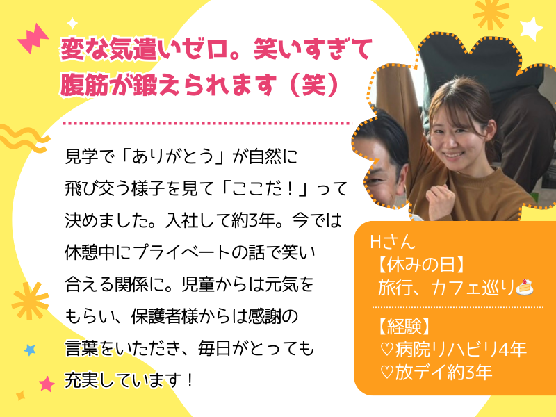 仕事内容 保育⼠・幼稚園教諭の資格を活かしませんか! 障害のある⼦どもたちがあなたを待っています! \転職された元保育⼠さんスタッフたちに聞きました/ 「園⻑や先輩との⼈間関係の悩みがなくなった!」 「スタッフ同⼠仲が良く、チームワークも取りやすい!」 「保護者からのクレームが無い!むしろ毎⽇感謝される!」 「⼦ども⼀⼈ひとりとじっくり向き合える!」 「時間のながれが保育園よりもゆったり!」 「残業が本当にない!」 「休みの希望を遠慮なく⾔える雰囲気!」 弊社では、スタッフ全員が気持ちよく働ける環境づくりに⼒を⼊れております。 きっとあなたも、⾃分らしくのびのびと働ける環境だと思います。 <どんな放課後デイ?> スタッフ1⽇4〜5名体制。 約10名の発達障害のある⼦どもたちをサポート。 ⼦どもたちと⼀緒に、お菓⼦作りやお出かけなどの楽しい活動を⾏います。 宿題や課題のサポートも、⼀⼈ひとりに寄り添いながら丁寧に進めていきます。 ⼦どもたちの成⻑を間近で⾒守り、保護者の⽅と喜びを分かち合える、やりがいのある仕事です。 <1⽇の流れ(例)> 10:00:掃除、活動準備、書類整理など 12:00:昼休憩 14:00:送迎、⼦どもたちの⽀援 17:30:送迎 18:30:業務報告、終了 ※⼟⽇祝・⻑期休暇中は、午前中から⼦どもたちの⽀援を⾏います。 夏休みは、公園遊びや⾃然体験など、楽しいイベントが盛りだくさんです! ⼦どもたちの笑顔あふれる職場で、あなたの資格と経験を活かしませんか? 保育園での勤務経験のある⽅も歓迎! また、急なお休みにも対応しています。 お⼦様や介護などの家庭の都合による休みもお気軽にご相談くださいね。 < スタッフの声/保育⼠/Tさん> 2024年6⽉から勤め、あっという間に1年が経ちました。 児童には元気をもらい、保護者さまには感謝の⾔葉を多く頂き毎⽇充実した⽇々を送っています! スタッフは皆家族のように仲が良く、とてもアットホームな環境です! これからも北⾵と太陽のスタッフの⼀員として、チームワークを⼤切に楽しく児童・保護者様・地域のために勤めていきたいと思っています ∵‥∴‥∵‥∵‥∴‥∵ ◆スタッフのインタビュー動画 保育⼠から転職された20代⼥性の⽅や30代男性のリアルな声を掲載しています。 「どんな⼈が働いてる?」「障害児施設は初めて・・・」などの不安もきっと解消できるはず。 ぜひご覧くださいね♪ https://en-gage.net/kittakun/ ◆Instagram@kitakazetotaiyou_fukui ∵‥∴‥∵‥∵‥∴‥∵ \⾒学のみも歓迎♪/ ・18時〜もOK!お仕事帰りに10分だけでもOK ・カジュアルな服装で⼤丈夫です! ・希望される⽅はそのまま⾯接もOKご興味がある⽅は、気軽にお電話くださいね。 //////////////////////////////////////////////////// \お電話でのご応募も⼤歓迎!/ 080-3041-5799(採⽤担当:稲⽊) 担当の稲⽊は30代男性、気さくで⼦どもから慕われる優しいスタッフです。 質問だけでも歓迎!お気軽にどうぞ♪ //////////////////////////////////////////////////// 児童発達⽀援、放課後児童クラブ、児童指導員、発達障害児童の⽀援の仕事をお探しの⽅に。 <放課後等デイサービス 北⾵と太陽とは> 障害者の⽀援を全般に、障がいを持つ⼦どもたちへの⾃⽴サポートを⽬的に活動している放課後等デイサービスです。 学校の授業終了後や学校休業⽇に通う、福祉サービスです。 当社は幼少期から⽀援することの重要性を感じ、今まで以上に⽀援の領域を広げていきます。 【福井県内全4拠点】 福井:福井市新保2-704-1 森⽥:福井市⼋重巻東町1-9 丸岡:坂井市丸岡町⾥丸岡2-5 松本:福井市幾久町2-13