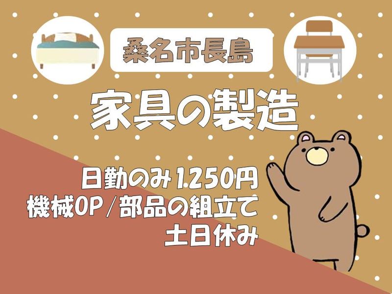 仕事内容 製造課でのベッド枠組みの組み立て、 部品セットのお仕事です。 ☆ベッドの枠をはめるだけ! 電動ドライバーを使用した ベッドの枠組みの組み立てや、 木材製品を機械へセットし 検査する工程を担当します。 <未経験が9割以上> 経験がなくても大丈夫! 先輩スタッフがやさしく指導します。 しっかりバックアップ・フォローします! <安心して働けます> コンビニも近く便利な立地! 快適な環境で作業ができます。 <プライベートも充実> 日勤のみで土日休みなので、 予定が組みやすく、 自分の時間を確保できます。 残業もほとんどありません。 毎日明るいうちに帰宅できますよ。