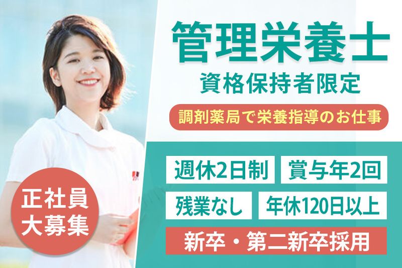 【雇用形態】 正社員 【契約期間】 試用期間3ヶ月、その後正社員のため無期雇用 【その他】 #管理栄養士資格 #未経験者歓迎 #新卒 #第二新卒歓迎 #有資格者歓迎 【ハローワークへの求人掲載について】 弊社の求人はハローワークに掲載していない案件が多数ございます。(ハローワーク求人掲載は期間が経つと自動的に掲載が止まるため)お気軽にお問い合わせください。 【このような方活躍】 薬局、調剤薬局での新卒管理栄養士(新卒スタッフ、新卒採用、新卒栄養士、新卒管理栄養士、新卒栄養士 管理栄養士)で未経験から働きたい方。栄養士や新卒管理栄養士として働きたい方。管理栄養士資格をお持ちの方。週休2日、年休120日~、残業なしの医療企業で新卒管理栄養士として働きたい方。未経験、新卒、第二新卒も活躍している職場で働きたい方。新卒管理栄養士として正社員で働きたい方。新卒管理栄養士を新着急募。新卒管理栄養士、管理栄養士 正社員、特定保健指導 管理栄養士、管理栄養士 栄養指導、栄養士。