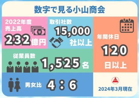 仕事内容 【業績安定・好調】創業111年の当社は、寝具やタオル類を中心としたリース業のリーディングカンパニー。 【2011年以来、15年連続賞与年3回支給も実現!】 「病院やホテルの布団は、誰が用意して、洗濯しているのだろう?」と考えたことはありますか? 実は、これが私たちの仕事です! 小山商会は医療・福祉施設、寮、保育園、ホテルや旅館、スポーツジム、温浴施設などへ寝具・リネンを貸し出し、定期的に回収しクリーニング・メンテナンスまで行っています。 清潔なタオルや寝具類を整えておくことは、利用者が気持ちよく過ごせるだけでなく、施設への信頼を支えることにもつながります。 当社はそんな高品質なサービスや、安心・清潔を陰から支える仕事をしています。 地味に聞こえるかもしれませんが、日本で100年以上続く企業はわずか1%程度しかありません。 現在では全国35拠点・従業員数1500名以上と、需要が変動しづらい業界だからこそ堅実な成長が実現できています。 特に日本中が大変だったコロナ期では職を失う方も多く居るなか、病院もお客様である当社の業績はほぼ影響を受けませんでした。 さらに近年、高齢化社会で病院・介護施設からのご依頼は増加の一方。 加えてアフターコロナの現在では観光業(ホテル・旅館など)にも活気が戻り、業績は非常に好調です。 こうした増加するご依頼にもっと応えられるよう、営業の枠を拡大するため募集に力を入れています。 【ノルマなし・既存顧客のフォローがメイン】こだわり寝具のリースを病院・ホテル等にご提案下さい。 <具体的な仕事内容> 担当エリアのお客様を、1日4~5件ほど訪問。 商談・新商品のご案内・見積作成など。 既に信頼関係のできあがっているお客様を担当するため、新規の飛び込みややテレアポ漬けなんてこともありません。 未経験の方の営業デビューにはもってこいの職場です! (※将来的に成長してきたら、既存を後輩に任せて新規へのチャレンジもしていただくことがあります。) 【当社の強みと仕事の魅力】高品質なリネンをお届けできる自社体制 清潔な病院着やシーツ、布団は病院にとって欠かせません。 当然ホテルにおいてもパジャマやガウンの着心地、寝具の心地よさは評価に繋がる重要なポイントです。 そんな高い要求水準にも応えられる技術を持った自社ランドリー工場を多数保有しており、リーズナブル・高品質・スピーディーな納品が可能な体制が当社最大のウリ。 どんな汚れもピカピカでいつも最高の使い心地になるよう、ベッドシーツの肌触りやタオルのふわふわ感にもこだわって仕上げています。 【充実の教育制度をご用意】特に若手も多い当社では営業デビューの方もしっかりフォローします。 当社では中途中心・異業種からの転身者が多いの会社のため、あなたの不安は社員の多くが深く理解していると思います。 未経験~営業経験者まで、どなたでもきちんとフォローするので安心してください。 また慣れてくれば、自分の裁量で1日のスケジュールを管理でき直行直帰も可。 そんな一人前になるまでは細かく丁寧にサポート致します! <1人前までのイメージ> ▼入社後1週間:社内研修を実施 ※商品知識・業界の知識など ※未経験の方は名刺交換から教えます ▼3~6ヶ月:先輩社員とのOJT研修 並行して納品等を通じて、商品知識や商談の進め方を学びましょう。 ▼6ヶ月~1年を目途に1人立ちを目指しましょう 徐々にお客様をご担当いただきます。 【当社詳細】 <事業概要> ■寝具類一切のリース及び販売 ■寝具類の製造販売並びに再製加工 ■病院用基準寝具の製造販売・洗濯並びにリース ■ホテル・旅館等へのリネン製品の提供 <会社概要> 本社所在地:宮城県仙台市青葉区花京院2丁目2-75 小山ビル 設立 :1958年 3月 代表者 :小山 喜康 従業員数 :1,525名(男子578名・女子947名) 資本金 :5,000万円 売上高 :277億円(2024年度) 平均年齢 :33歳