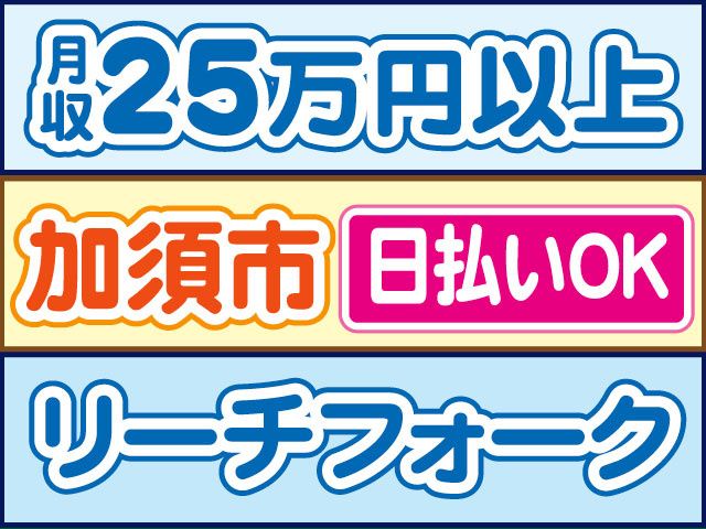 仕事内容 高時給、フォークリフトスタッフ大募集 50代の中高年の方も活躍中 日勤専門でも月収25万円可 【フォークリフトスタッフのポイント】 〇高時給1550円 〇資格を活かせる 〇日勤のみ 〇土日休み 〇大型連休あり 〇ほとんど乗りっぱなし 〇20代30代40代50代前半の男女活躍中 〇履歴書不要 〇日払いOK(規定内) 〇交通費支給(規定内) 〇「マイリク定着支援」導入企業 【フォークリフトスタッフの仕事内容】 加須市にある倉庫でのお仕事 フォークリフトを使って ・プラスチックの箱を運搬 ・入出庫 ・倉庫内の清掃 ・その他付随業務 などをお願いします。 ほぼフォークリフトに乗りっぱなしです! 職場見学(30分~1時間程度)を実施しております。 実際に作業内容を見てから決めていただけます! 【勤務について】 〇日勤のみ 7:00~16:00(実働8時間) 〇土日休みの週休二日 大型連休あり 急な発熱・体調不良・冠婚葬祭など、 突発的なお休みに柔軟に対応しております。 【こんな経験活かせます!】 下記経験者は前職活かせます。 〇倉庫内作業・構内作業パート・アルバイト 〇ピッキング・仕分けパート・アルバイト 〇軽作業パート・アルバイト 〇フォークリフトでの入出荷 〇倉庫内派遣 〇主婦・主夫パート(職種不問) 〇中高年パート 前職不問で採用しております。 ブランクのある方OK(経験の浅い方もOK) 〇ご不明な点はお気軽にお問い合わせください〇 お電話でのご応募、ご質問も受付中! 株式会社ロフティー白岡支店 スタッフ採用担当まで TEL0800-222-6888(フリーダイヤル) お仕事情報はこちら https://entori.jp/lofty-shiraoka コーディネーター・定着支援のWサポート体制導入 「マイリク定着支援」導入企業! アンケートで職場の様子を確認し、 コーディネーター・定着支援担当が連携してサポート。 はじめての派遣でも安心して働けるよう迅速かつ 丁寧にサポート対応いたします。