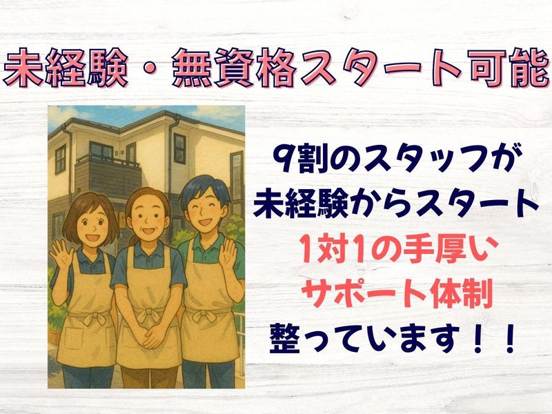 求めている人材 こんな方に向いています ▶人の役に立つ仕事がしたい ▶安定した正社員として働きたい ▶未経験から一生モノの仕事を身につけたい ▶家庭と両立したい ▶将来は管理職・キャリアアップも目指したい ▶無資格未経験者の方 ▶有資格(福祉系資格)の方 ・キャリアアップ出来る環境で働きたい方 ・業務や努力を正当評価されたい方 ・意見や提案がしやすい環境で働きたい方