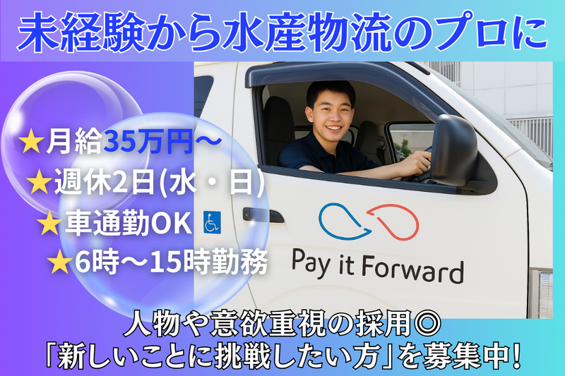 仕事内容 <>-<>-<>-<>-<>-<>-<> ★日本の台所“市場”を変える!★ 月給35万円以上×週休2日制 ~豊洲から世界へ~ 魚の新しい物流をつくる挑戦に、 一緒に立ち上がりませんか? <>-<>-<>-<>-<>-<>-<> \働く上でのポイント~5選~/ ◇ 朝6時〜15時勤務 → 午後は完全自由! ◇ 月給35万円以上&固定給制で安心収入 ◇ 週休2日制(水・日)でしっかり休める ◇ 「市場前駅」から直結徒歩5分 ◇車・バイク通勤OK 【仕事内容】 鮮魚・冷凍・乾物など水産物を仕分け・積み込み、取引先に届ける仕事です。 ◇豊洲市場内での商品ピッキング ◇ハイエースでの配送 └首都圏の居酒屋や寿司店などの飲食店へ ★未経験OK!まずは、現在配送業務を担っているスタッフに同行しながら、ルートや作業の流れをOJTで学んでいきましょう。 ★新規事業の立ち上げメンバーとして、一緒に仕組みをつくっていけるポジションです。 - 【株式会社Pay it Forwardってこんな会社!】 “Pay it Forward”とは「恩送り」。 「恩は返すのではなく、次の人へ渡すもの」という代表の恩師の言葉から生まれた社名です。 私たちは飲食業界への恩送りを使命に、“人”と“食”に向き合い、業界のニュースタンダードをつくる会社。 たとえば廃棄されていたマグロの部位を新しい流通経路でお客様に届け、2023年には数十トン規模の活用を実現。 社会課題の解決を通じて利益を生み出し、従業員やお客様に還元してきました。 飲食店運営・プロデュース・市場事業など多彩な事業を展開しつつ、今回新たに挑戦するのが「豊洲市場での配送事業」です。 さらに、魚の物流が整っていないベトナムでの海外展開も視野に入れています。 「市場から日本を、そして世界を変える」挑戦を共に進めていきましょう。 - 【共に“市場革命”を起こす仲間を募集!】 私たちは、豊洲市場から日本の台所を変え、魚の新しい物流を世界に広げていこうとしています。 すでにベトナムでの飲食店展開を進めており、まだ魚の物流が整っていない国で挑戦を始める準備も進行中です。 そんな新規事業の中核を担えるのが、今回募集する配送スタッフ。 市場の常識を変え、日本から海外へ挑戦していけるチャンスがあります。 ただの配送スタッフではなく、新しい仕組みを共につくり上げる“仲間”として迎えたいのです。 ◇ 向上心を持ち、挑戦を楽しめる方 ◇ 「市場勤務=不安定」というイメージを変えたい方 ◇ 日本の食文化を盛り上げたい方 ◇ 将来的に海外展開にも携わってみたい方 ◇ 仲間と一緒に新しい事業を立ち上げたい方 - 【働くメリットはコチラ!】 <“市場勤務”のイメージを変える安定収入> 日給制が多い市場の中で、月給制を導入。毎月の生活が安定し、安心して働けます。 <午後は自由!新しいライフスタイル> 15時退勤だから、ジムや趣味、家族時間、資格勉強など… 働きながら自分の時間も大切にできます。 <週休2日でリズム良く働ける> 市場勤務では珍しい「水曜・日曜休み」の週休2日制。 市場カレンダーに合わせつつ、無理なく休める環境です。 - 市場から日本を、そして世界を変える挑戦は、今まさに始まったばかり。 新しい物流をつくり、未来を動かすその一歩を、ぜひあなたと一緒に踏み出したいと思っています。 “挑戦を楽しめる仲間”として、私たちと共に成長していきませんか?