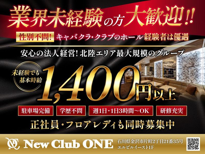 仕事内容 【この求人のポイント】 ✅ 今年4月OPEN!新しい環境でスタートできる安心感 ✅ 日払いOKで収入の安定もバッチリ ✅ 週4〜5日勤務できる方歓迎!将来の正社員登用も視野に働ける ✅ 工場勤務・コンビニ夜勤など「黙々作業系」の経験が活かせる 【募集背景】 2025年4月1日、金沢・片町に「New Club ONE」がオープンしました。 安定的に勤務できるスタッフ体制を整えるため、 週4〜5日勤務できる準フルタイムメンバー を追加募集しています。 「まずはアルバイトから入り、ゆくゆくは正社員として働きたい」 そんな方にもピッタリのポジションです。 【仕事内容】 ホールスタッフとして、店舗運営に関わる幅広い業務を担当していただきます。 難しい作業はありませんが、丁寧でスムーズな対応が求められる“お店の要”となるポジションです。 ▼具体的には ・お客様のご案内・お見送り ・ドリンク配膳、テーブルの片付け ・ホール業務全般のサポート ・備品管理や簡単な清掃 ・店舗運営業務の補助(※正社員登用後はより広い業務を担当) コンビニ夜勤/工場のライン作業/飲食店の夜勤など、 「手順に沿って黙々と進める仕事」が得意な方はすぐに活躍できます。 【求める人物像】 ・週4〜5日しっかり勤務したい方 ・将来的には正社員として安定して働きたい方 ・夜勤経験(工場・コンビニ・飲食)を活かしたい方 ・接客より裏方寄りの動きが得意な方 ・長く働ける職場を探している方 【収入例】 時給1,400円 × 7h × 週5日 × 4週 = 月収約196,000円 日払いも可能なので、生活リズムに合わせて収入管理しやすい環境です。 【キャリアパス】 しっかり働きたい方には明確なステップをご用意しています。 ・ホールスタッフ(アルバイト) ↓ ・正社員登用(スタッフ管理・企画など) ↓ ・サブマネージャー(教育や運営補助) ↓ ・マネージャー(店舗運営・売上管理) 経験よりも“まじめな勤務姿勢”を評価します。 夜勤経験者・体力仕事経験者も多数ステップアップしています。 【先輩の前職例】 工場作業員/倉庫仕分け/フォークリフトオペレーター コンビニ夜勤スタッフ/飲食店深夜勤務 警備スタッフ/清掃スタッフ 居酒屋ホール/イベント運営/学生の深夜バイト など 「接客が初めてだった」というスタッフも多く活躍中です。