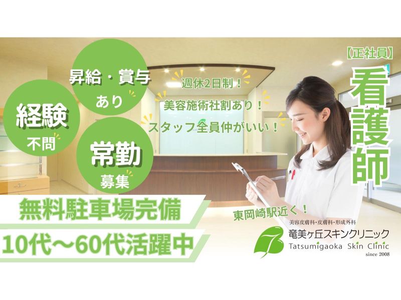 仕事内容 ***************** 業務拡大により新しい仲間を募集★ 看護師のお仕事!未経験OK◎ 長期休暇ありでプライベートも充実♪ ***************** 皮膚科、美容皮膚科、形成外科における看護師業務全般、 医院の運営に関わる業務をお願いします。 皮膚科のお仕事が初めての方も大歓迎◎ 看護師の方にお任せするお仕事は、 採血や点滴、診察や治療のサポート業務が中心です。 <<予約制のクリニックです!>> 「竜美ヶ丘スキンクリニック」は岡崎市にある地域に根差したアットホームなクリニック。 皆さまのお肌の悩みに最適な治療をご提案してきました。 今回はそんな当院で働いてくれる新しい仲間を募集。 看護師・准看護師免許があれば、皮膚科未経験でもOKです◎ <<夜勤なし!「プライベート」を大切に働ける!>> 当クリニックの診療時間は9:30~18:30まで(土曜日は9:30~15:30) 診療は予約制となっております。 また、クリニック自体のお休みも毎週水曜日と日曜日の完全週休2日制。 「友達と週末の予定が合わない。」...なんて心配もなく、 プライベートを大切にして働くことができますよ。 <<美容・スキンケアの知識が身につきます★>> 当院では、様々なお肌の症状に対して、 皮膚科専門医の立場から最適な治療をご提案しています。 美容皮膚科にも力を入れており、脱毛やレーザー治療なども数多く行っています。 そんな最先端の環境が整っている当クリニック。 働きながら、お肌やスキンケアに関する知識を身につけることができます。 スキルアップに関する各種制度もご用意しており、 希望される方は、学会や研究会へもご参加いただけます。 「働きながら自分も磨きたい。」という方にもピッタリの職場です。