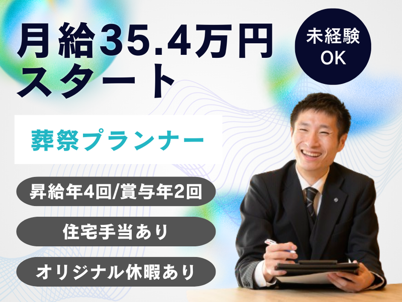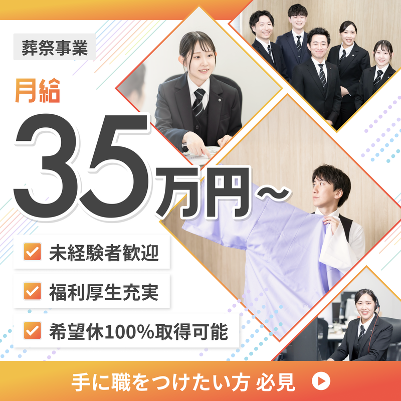 仕事内容 ー ★求人ポイント スキルUP&高収入ゲット! ー ■初めての方でも月給35万円以上! ┗ 頑張った分はしっかり還元 2年目で年収500万円以上が可能です◎ 4年目には年収700万円も! ■未経験から専門技術を学べる研修制度有 ┗ 未経験の方も安心してご応募ください ■国内唯一の納棺師育成学校 「おくりびとアカデミー」を運営 ■豊富な各種手当あり 高水準の会社で長く安定して働きたい方に ピッタリのお仕事です◎ ー 主な仕事内容 ー 【施行担当】(1日1~2件) ■受注担当からの引継ぎ ■役所手続き(死亡届提出など) ■故人様のケア (初期処置、整髪・化粧直し、納棺の儀等) ■会場設営 (祭壇や仏具の準備、協力会社との連携) ■式当日の進行や火葬場への同行 など 【受注担当】 ■ご家族との打ち合わせ (日程・会場・式の形式など) ■ご希望に沿ったプラン提案 (祭壇の花・お棺の種類・仏衣など) ■発注や書類作成、施行担当への引継ぎ など ┗ 概ね3日~1週間程:1日2件程 ┗ ご入社後はまず施行担当として 活躍していただきますが、 ・打合せの研修を経て、受注専門スタッフ ・施行・納棺・受注とマルチに活躍 ・マネジメントスタッフ(チーム運営) など、『施行×納棺×受注』で幅広く スキルアップできる環境を整えています◎ ════════════════════════════════════════ ★2008年公開の映画『おくりびと』でも 広く知られるようになった「納棺師」も、 当社では大切な役割のひとつ。 故人様を清め、身支度を整え、 最後のひとときを美しく演出する ――特別な技術を持つ専門職です。 ★2026年2月公開予定の 映画『ほどなく、お別れです』の 「葬儀監修」として携わっています! ════════════════════════════════════════