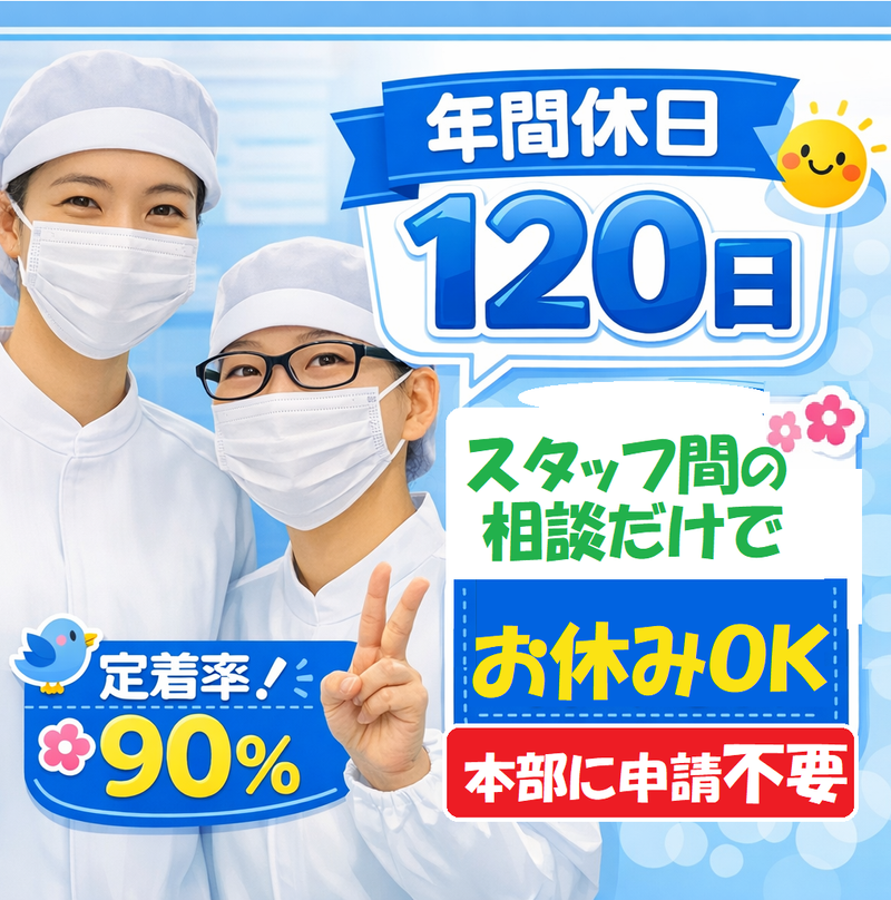 職場環境 現在、スタッフ全員女性。11名在籍中 「今日の給食、完食だったよ!」と全員で喜び合う穏やかな職場です。 「お休みはお互い様」という文化が根付いており、急な用事や学校行事も相談だけでパッと調整OK お互いを支え合えるから、3年定着率90%と抜群の安定感です