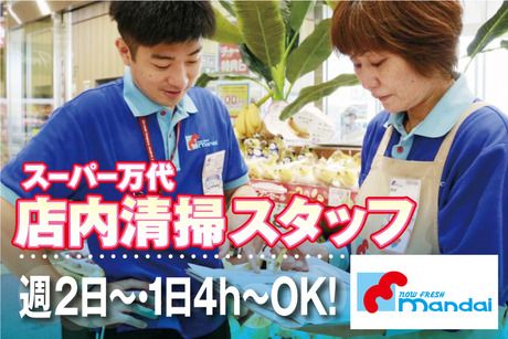 仕事内容 【 仕事内容 】 <スーパー内での店内清掃業務> お客様に気持ちよくお買い物してもらえるよう、 キレイ&清潔な店内を保つ大切なお仕事です! ★細かな気遣い一つが魅力アップにつながる! ★お客様から「いつもキレイね」と お声がけいただくこともあり、やりがいも◎ 【 仕事の流れ 】 <1日の流れ(例)をご紹介!※早朝勤務の場合> ▼出勤! 店内清掃スタート! ・掃除機やモップがけ など。 ▼店舗オープン! ・ゴミ捨てや開店後に出たゴミの回収 ▼お仕事終了! 【 未経験でも安心! 】 <丁寧な研修&フォロー体制が自慢!> 経験やスキルが無くてもOK◎ 普段の掃除に役立つコツや テクニックが身に付くかも♪ <シフト相談OK!> 「ブランク明け」「お仕事復帰」もOK! 短時間OK◎お小遣い稼ぎにも最適♪ 「子育ても落ち着いたしフルで働きたい」など 家庭の事情はお気軽にご相談ください◎ 【 万代の魅力 】 <「万代スタッフに聞いた!」働く魅力をご紹介!> ・家から近く通勤しやすい! ・お仕事終わりに買い物ができる♪ ・新人さんも馴染みやすい◎ ・常連さんが気さくに話しかけてくれる! ・髪型・髪色は比較的自由! 自分らしく働ける環境で、のびのびと活躍できます。 「私でもできそう!」「やってみたい!」 そんな方はぜひご応募ください♪ スタッフ一同、あなたからのご応募お待ちしております!