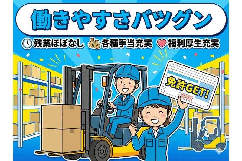 \フォークリフト免許必須/月給20万円~/日払い制度あり/週休二日制/土日祝休/残業なし/長期休暇/福利厚生充実