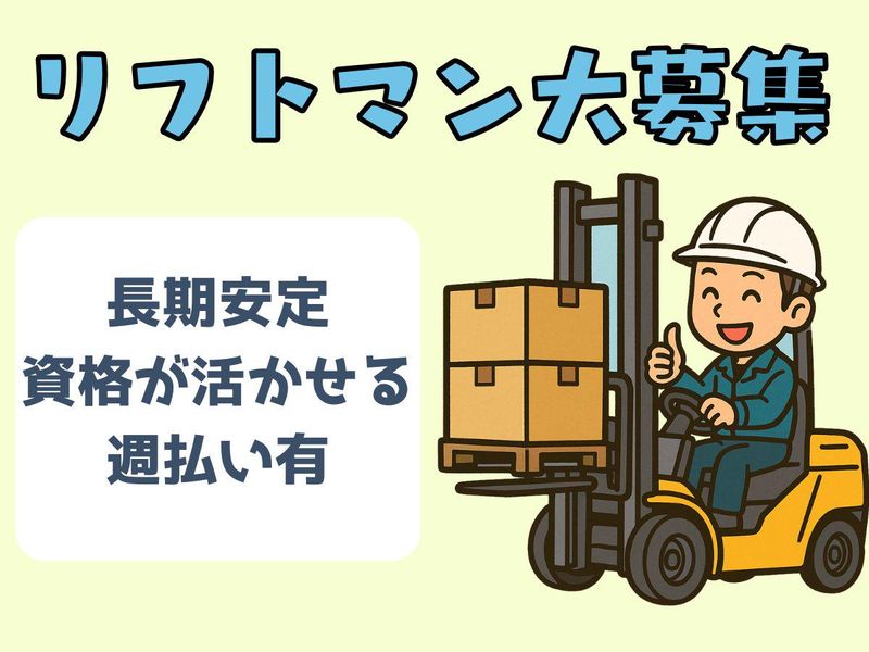 求めている人材 ・フォークリフト免許をお持ちの方 ・リーチリフトでの実務経験がある方 ・チルド倉庫での作業に抵抗がない方 ・安定して長期で働きたい方 ・モクモク作業が好きな方 ・20~50代の男性スタッフを中心に活躍中! 「資格を活かして働きたい」「ブランクはあるけど現場復帰したい」という方も大歓迎! 安全第一で丁寧に作業できる方をお待ちしています◎