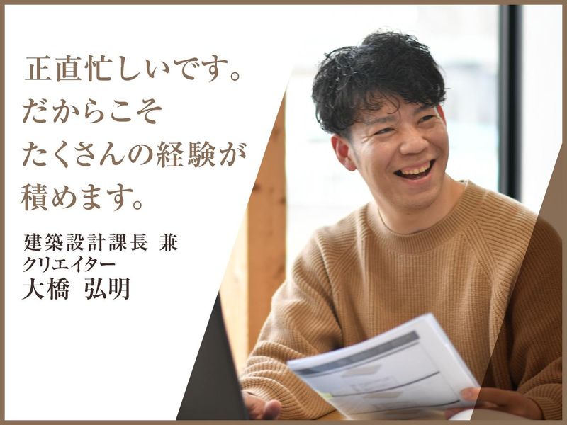 仕事内容 未経験・無資格OK! ◇設計・CADオペ ◎お客様の「どんな家に住みたいか」を 聞き、間取りやプランを考えます ◎専用ソフトを使って図面を作成 ◎打ち合わせ内容を整理し、 申請や手続きのサポートも行います ◇インテリアコーディネーター ◎壁や床、キッチン、照明、家具などを トータルでコーディネート ◎お客様の好みに合わせて、 住まいの空間づくりを提案します ★- 「ひとめぼれ採用」スタート! -★ あなた「この会社で働きたいな」 私たち「この人と働きたいな」 そんな出会いは、きっと“ひとめぼれ”。 経験者は即戦力として活躍可能。 CADやインテリアからの キャリアチェンジも歓迎します。 もちろん未経験も大歓迎。 先輩が丁寧に教えるので安心してください。 私たちCOLORSは、まだ夢の途中。 誠実で思いやりのある仲間と 長く働けたら嬉しいです。 これから紹介する設計も、 会社と“ひとめぼれ”した2名です。 ★- 建築設計課長 兼 クリエイター 大橋 弘明(2025年9月入社) -★ 以前は当社の下請け会社で勤務。 外から見ていて、COLORSの人たちは いつも楽しそうで、実はずっと 片想い状態でした(笑) 部署が解散することになった時、 思いきって中村社長に 「仲間になりたいです!」と告白。 今では設計だけでなく、 営業とも意見交換しながら チームで家づくりができています。 派閥も部署の垣根もなく、 社長にも直接相談できる環境。 「やりたいことがあったらやればいい」 そんな前向きな社風なので、 どんどんチャレンジできます。 会社は今、ものすごいスピードで成長中。 毎月1〜2棟、モデルハウスも増えています。 忙しさも面白がれる人。 新しいことに好奇心を持てる人。 そんな方はきっと合うと思います。 ★- 建築設計課長 兼 チーフコーディネーター・クリエイター 濵田 亜紀(2024年6月入社) -★ 私は「設計×営業」の視点を 大切にしています。 いい家づくりは評判や口コミとなり、 結果的に集客につながるからです。 COLORSの家は天然木が魅力。 デザイン性が高く“ひとめぼれ” されることが多いのが特徴。 SNSやモデルハウスを見て 「この家に住みたい!」 と来場されるお客様が多く、 そこから家づくりが始まります。 私がCOLORSに惹かれたのは、 高品質な家づくりができることと キャリアアップできる環境。 入社後は社長が直接 「最近どう?」と声をかけてくれるなど、 人の温かさを感じています。 未経験の方も歓迎。 モデルハウスをどんどん建てているので 実践の中で成長できます。 まずは1棟、手掛けてみましょう! ⚫︎施工事例 YouTube https://www.youtube.com/@TOMOCOLORS/videos Instagram https://www.instagram.com/colorskoumuten/