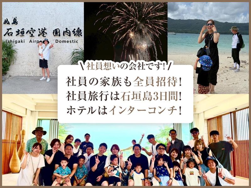 職場環境 社員想いの会社。昨年度の社員旅行は、みんなで石垣島に3日間行ってきました。ホテルはラグジュアリーなインターコンチネンタル。家族まで招待とあって、社員全員が気兼ねなく楽しめました。ウチの社長、冷静に考えてみると、かなり太っ腹ですよね(笑)。 喫煙所:喫煙所あり(屋外)