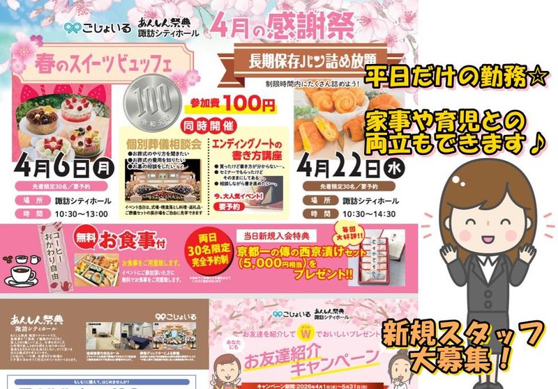 仕事内容 ★新生活のリズムが整ってからの勤務スタートもOK! ★お子様の入園・入学に合わせてお仕事始めたい方も歓迎! (※ブランクある方もご安心下さい☆) ★2026年新規オープンにつきオープニングスタッフ大量募集! ★勤務は平日のみ。1日2h~、短期・短時間もOK! ■嬉しい特典!ハッピーボーナスあり! 研修期間を卒業で10000円のお祝い金をプレゼント! (※条件/研修期間3ヶ月をクリアーして継続勤務) ■勤務開始日もお気軽にご相談ください。 <お仕事内容> イベントチラシのポスティングになります。 具体的には、 ・諏訪エリア内のご家庭へ徒歩でご案内のポスティン グ ・写真のようなチラシやハガキの配布 ・簡単なPR ・イベントでの受付・接客・事務作業 (※未経験の方でも気軽にお仕事を始められるよう1つ1つ丁寧にお伝えいたしますのでご安心下さい) <嬉しいポイント> 朝はゆっくり10時スタート! 平日のみ、月10日の勤務でOK! 短期・短時間も可!(1日2時間~) 面接時には履歴書不要! 髪色・髪型・服装自由!(過度でなければOK) お子様やご家庭優先の働き方でOK