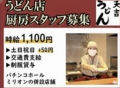 仕事内容 ▼カンタン調理!! パチンコ店内にある セルフうどん屋さんでのお仕事です。 <具体的な業務内容> ・食券を確認 ・カンタン調理 ・カウンター越しに料理お渡し 食券制なので注文を取る必要なし! レジ対応もありません。 うどん、そば、ラーメンなど麺を茹でて、 調理済みのトッピングをのせるだけ! また、メニューは10種類ほどしかなく、 飲食未経験の方でも大丈夫! すぐに覚えられます! ▼スキマバイトにピッタリ!! ・セルフ店なので、カンタン調理のみ ・11~15時の1日4時間のみ ・朝ゆっくりしたい人にオススメ! ・スキマバイトにピッタリ! ・Wワーク大歓迎! ・扶養内OK ・ランチ時間帯なので「あっ」という間に時間が過ぎます!