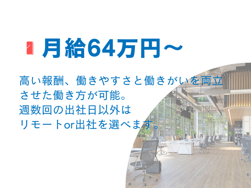 職場環境 ■働きやすさと働きがいを両立させた働き方 週数回の事業部出社日以外はリモートor出社を選べるスタイルです。 対面によるメンバー間の関係構築促進のため、あえてフルリモート制にはせずチームのメンバーと顔を合わせて仕事をする機会を設けています。 喫煙所:喫煙所あり(屋内) 施設の敷地内又は屋内を原則禁煙とし、喫煙専用室等を設けています。