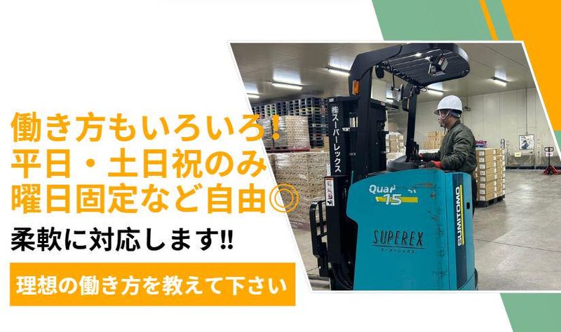 仕事内容 ━━━━━━━━━━━━━ ◎【肩書きより、安定収入】 ━━━━━━━━━━━━━ 肩書きに縛られずに胸を張りたい30代へ。 アルバイトでも賞与あり、時給1500円。 無理なく続けながら、生活を安定させる働き方です! 正社員か、フリーターか。 その間で迷う30代にとって、 ちょうどいい安定がここにあります♪ お任せするのは食品物流センターでのフォークリフトと仕分け業務です! ////////////////// 【具体的な仕事内容】 ////////////////// ⏩ リーチフォークリフトでの入庫作業 ⏩ 商品の数量確認・所定場所への格納 ⏩ 軽作業エリアへの商品移動 ⏩ ハンディを使った在庫確認(棚卸) ⏩ 商品の仕分け作業 ////////////////// トラックへの荷積み作業はありません! 検品は別担当が行うため、 フォーク作業に集中できる環境です◎ リフト作業5割、その他仕分け作業5割。 1日の流れはある程度決まっているので、 慣れれば落ち着いて取り組めます♪ ━━━━━━━━━━━━━ ◎【ちょうどいい安定】 ━━━━━━━━━━━━━ 時給1500円! 月22日勤務で月収26万4000円可能✨ さらに年1回ミニ賞与あり! 冷凍庫作業には手当も付きます! 残業はほとんどなし。 週2日から相談OK。 基本曜日固定ですが変更も相談できます♪ 派手さはありません。 でも、ちゃんと生活が回る仕事です! ━━━━━━━━━━━━━ ◎【見学してから面接OK】 ━━━━━━━━━━━━━ まずは職場見学だけでも大歓迎! 実際の雰囲気を見てから決められます◎ 未経験の方も、乗車からしっかり教えます! ━━━━━━━━━━━━ ◎【アピールポイント】 ━━━━━━━━━━━━ ✅ミニ賞与あり ✅お休みも担当の社員に相談しやすい! ✅食堂有、レンジ、ポット、自販機有 ✅職場見学してから決められます。 ✅髪型・髪色自由 【関連ワード】 希望シフト制、曜日自由、 工場、製造、梱包、流通、配送、 安定、フリーター、フォークリフトオペレーター、 リーチフォーク