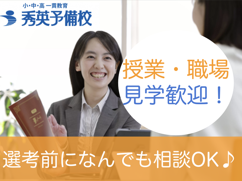 選考プロセス <選考の流れ> 1,書類選考 2,1次選考(筆記試験、面接) 3,最終選考(面接) <選考会場> 在住地域の秀英予備校、またはZoom (オンライン面接可)