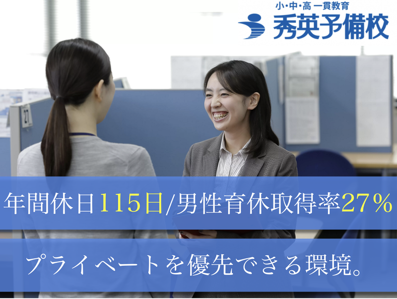 仕事内容 【20代・30代・40代が活躍中】 【キャリアもプライベートも両立可能】 授業担当なし・完全週休2日・残業月17h。 教育業界でのご経験が2年以上あればOK。 「教育に携わりたいが、今の働き方は辛い、、」 「成長を見るのは好きだが、残業が多すぎる、、」 そんなあなたにピッタリ! 充実福利厚生の環境が整った大手上場企業で 『塾のスクールマネージャー』に キャリアを再構築しませんか? ◆あなたの経験が輝く環境! ━━━━━━━━━━━━━━━━━━━ ✅月平均残業20時間/有給取得実績◎ 自分の時間も大切にしたい 20代〜30代に輝いて欲しいから 働きやすさにこだわっています ✅平均年齢は30代、勤続年数12年 長期的なキャリア形成を目指したい 20代〜40代の方が多く活躍中。 人間関係の良さと働きやすさで 無理せず、キャリアアップできます。 ✅年功序列はなし!最短1年の昇格事例も 年齢や社歴に関係なく、キャリアアップ可能 若手でも、正当に評価しスキルに 見合ったポジションと待遇を用意します。 経験や教育への情熱を活かし、 1年で教室長に昇格した若手社員事例も多数! ┏━━━━━━━┓ ◆ お仕事内容 ◆ ┗━━━━━━━┛ 『校舎』という一つの事業を動かす 裁量権の大きな仕事です。 ※授業はアルバイト講師が行うので、校舎運営に集中できます。 ■具体的には・・・ ・生徒1人ひとりの学習プラン作成 ・生徒、保護者との面談 ・アルバイト講師の管理、育成 ・ミーティングシート作成 ・校舎内掲示 ・生徒の出迎え、見送り ・質問対応 ・コミュニケーションアプリで保護者との連絡 ・生徒募集活動 季節ごとのお仕事 春:新規入学の対応、新学期スタートによる生徒対応 夏:夏期講習参加者の対応、中3、高3受験生対応 秋:塾生の進路面談、受験勉強アドバイス 冬:冬期講習参加者の対応、学年末テスト対応、新規講師採用 ✅教員や塾講師の経験がある方へ。 「授業準備に追われる毎日」や 「終わりの見えない残業」から卒業しませんか? ここでは、授業は講師にお任せ。 あなたは「生徒が学びやすい環境づくり」と 「進路・学習のカウンセリング」に専念できます。 あなたの現場経験が、生徒の成績向上に直結する仕事です。 ┏━━━━━━━━┓ ◆ 1日の流れ(例) ◆ ┗━━━━━━━━┛ ▼13:30 出社・校舎開校準備 教室の清掃、設備確認、当日のスケジュール確認を行います。 ▼14:00 校舎開講準備・事務作業 平日であれば夕方からの授業の開校準備をします。 ▼15:00 休憩 ▼16:00 講師ミーティング アルバイト講師と授業運営に関するミーティングを行います。 ▼17:00 個別指導授業サポート アルバイト講師の授業実施のサポート、電話対応、面談対応を実施します。 ▼21:00 明日の準備・清掃 アルバイト講師からの授業報告聞き取り、清掃、翌日の準備を行います。 ▼22:30 退社 ◆仕事のやりがいを、長く。 ━━━━━━━━━━━━━━━━━━━ 年間休日115日/長期休暇あり プライベートも大切にできるから、 仕事への情熱も燃え続けます。 勤続年数12年 - 平均年齢37.1歳 ”教育業界はブラック。。。?” そんなイメージと弊社は真逆です! 勤怠システムで勤務時間を1分単位で管理。 サービス残業・休日出勤なんて、ありえません。 人間関係もよく、働きやすさを追求する社風だから 若手の方の定着率もトップクラスなんです。 ◆ライフステージの変化にも対応 ━━━━━━━━━━━━━━━━━━━ 産育休取得率100%、男性育休取得率27.3% 時短勤務や週休3日制度など、 キャリアを諦めない仕組みがあります。 ◆授業・校舎見学歓迎!選考前に何でも相談OK ━━━━━━━━━━━━━━━━━━━ 選考前の不安や疑問は、実際に見て・話して解消できます。 校舎や授業の見学、現場で働く社員との座談会も随時実施中!