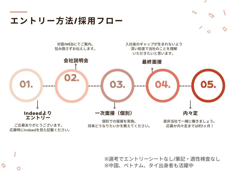 選考プロセス (1)Indeedよりエントリー (2)会社説明会:対面/WEBにて実施 (3)一次面接(個別) (4)二次面接(個別) (5)最終面接(個別) (6)内々定 ※内々定までの所要日数:1カ月以内 ※既卒者は卒業3年以内の方