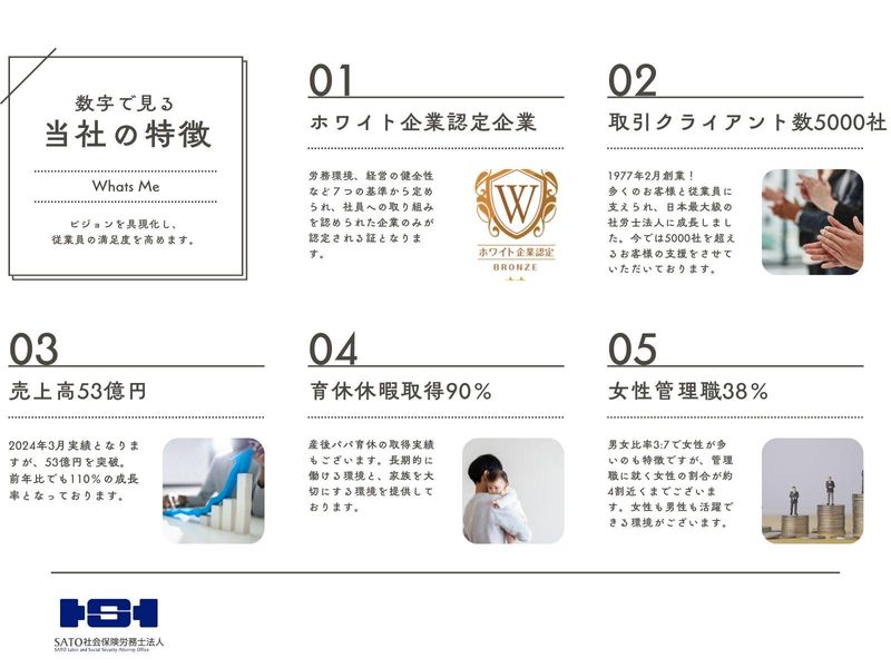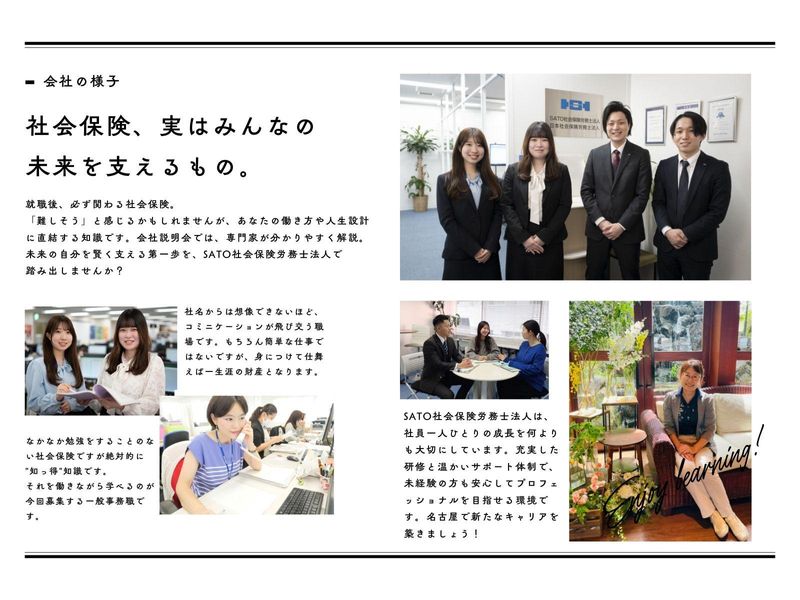 仕事内容 -*-*-*-*-*-*-*-*-*-*-*-*- 土日祝休み×転勤無×ホワイト企業認定取得! 日本最大手の社会保険労務士法人。 -*-*-*-*-*-*-*-*-*-*-*-*- ・27年卒の皆様へ 弊社ページを閲覧いただきありがとうございます! SATO社会保険労務士法人 名古屋オフィスは、 未来を担う27卒の皆さんを、事務スタッフとしてお迎えします。 平均残業時間20-25時間でプライベートも充実! 年間休日120日以上で、ワークライフバランスも大切にできます。 9割の先輩が未経験から専門スキルを習得し、 入社3年目で月給27万円も夢じゃない! ホワイト企業認定取得の安定基盤で、 あなたの新しいキャリアをスタートさせませんか? - ≫————求人の特徴—————≪ ◎ 平均残業時間20~25時間! ワークライフバランス重視派も安心! ◎ 年間休日120日以上! プライベートも充実できる環境です。 ◎ 9割が未経験から専門スキルを習得! 充実の研修制度でゼロから成長。 ◎ 入社3年目で月給27万円も可能! 頑張りが正当に評価される給与体系。 ◎ ホワイト企業認定取得! 安心して長く働ける安定基盤。 ◎ 名古屋駅から徒歩圏内! 通勤もラクラク、アクセス抜群のオフィス/転勤なし ≫——具体的な仕事内容——≪ 社会保険労務士法人での事務業務全般をお任せします。 お客様の「困った」を解決し、企業の成長を支えるやりがいのある仕事です。 ◎お客様との電話・メール応対:企業の人事・労務担当者の方々と直接コミュニケーションを取ります。 ◎健康保険・厚生年金・雇用保険の入退社時申請手続き:社員の入社・退社に関わる重要な手続きをサポートします。 ◎労働災害発生時の届け出:もしもの時の対応を円滑に進めるお手伝いです。 ◎傷病や出産に伴う給付金申請・手続き:社員のライフイベントをサポートする大切な業務です。 ◎年金事務所・ハローワークなどの行政機関対応:各種申請書の提出や問い合わせを行います。 ◎その他、一般事務全般:書類作成、データ入力、ファイリングなど、幅広い業務を通じて会社の運営を支えます。 業務は約3~7名のチームで行うため、一人で抱え込むことはありません。 入社後は社会保険の基礎知識や仕事の流れを覚えることからスタート。 丁寧なOJT研修で、未経験の方も安心して専門知識を習得できます。 ゆくゆくはクライアントを担当し、企業の人事・労務パートナーとして活躍する道も開かれています。 - ≫——物語の始まりは、名古屋の地から——≪ ・オフィス: 名古屋駅直結のオフィスは、活気ある街の中心に位置しながらも、 一歩足を踏み入れれば穏やかな時間が流れる空間です。 愛知県出身の方はもちろん、Uターン・Iターンを考えている方も大歓迎! 人口減少が課題となる地域で、 「ここで働きたい!」と思える魅力的なオフィス環境が、 あなたの新しい物語の舞台になります。 ≫——初めての正社員雇用は不安ですよね——≪ 「事務の仕事は初めて」 「専門知識がないから不安」 そんな心配は一切不要です。 当社では、9割の先輩が未経験からこの業界に飛び込み、プロとして活躍しています。 例えば、メーカーの一般事務、旅行会社の予約事務、金融機関の営業事務、 アパレルの販売員、人材業界のキャリアアドバイザーなど、 様々なバックグラウンドを持つ先輩たちが、充実した研修と手厚いサポートで社会保険労務士の専門知識を習得しました。 入社後3ヶ月間の研修プログラムでは、 社会保険の基礎から実務まで、体系的に学ぶことができます。 先輩社員がメンターとしてつき、あなたの成長を全力でサポート。 分からないことはすぐに質問できる環境です。 ≫——キャリアアップの可能性———≪ ・入社1年目:基礎的な事務業務を習得。電話対応や書類作成を通じて、社会保険制度の全体像を掴みます。 ・入社3年目:担当クライアントを持ち、自律的に業務を遂行。難易度の高い手続きや相談にも対応できるようになります。 ・入社5年目~:チームリーダーとしてメンバーの育成やマネジメントに携わる道、または特定分野のスペシャリストとして専門性を深める道も。 女性管理職も多く、実際に未経験入社1年目の方や子育てをしながらリーダーとして活躍する社員もいます。 年齢や社歴、資格の有無は評価に影響せず、あなたの意欲と能力次第で、20代でリーダーとしてマネジメントを任されることも夢ではありません。 ≫——心温まる職場の雰囲気———≪ 当法人の魅力は、何よりも「人」です。 社員インタビューにもあるように、困っている仲間がいれば自然と手を差し伸べ合う文化が根付いています。 ・ホームページ:https://graduates.recruit-sato-group.com/ ▼事務スタッフ/入社5年目 28歳 「仕事はチームで協力し合いながら進めています。もし誰かが業務に詰まっていたら、 作業を分担して手助けしたりするので心強さもあると思います。だからこそ、自分のことだけでなく周りに目を配ることも大切です。」 オンライン研修や国内・海外研修など、スキルアップの機会も豊富に用意されており