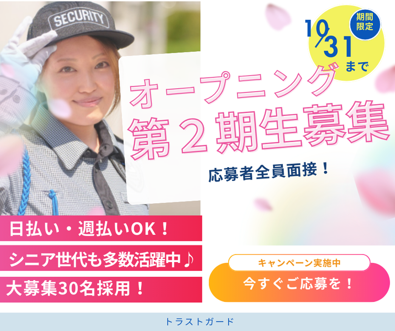 仕事内容 2024年6月立上げ企業! 現在は16名の少数精鋭で運営中! 当社代表の女性ならではの柔軟な考え方のもと 警備のお仕事をより快適に安全にと考え、 多くの現場のご依頼を頂いております! 未経験方にも丁寧研修ありで安心です! <オープニング第2期生募集> ★日払い・週払いOK ★週1日~OK ★シフト希望が99%通る! ★髪型・髪色自由 ★空調服を無料貸与 ★研修中は「昼食支給!」 週1日から働ける交通誘導スタッフ大募集! 現場は大阪市全域および県内に多数あり! <お仕事内容について> 住宅街やオフィス街での工事現場の交通誘導のお仕事! 車やバイクの進行を合図して誘導したり 事故を防ぐため歩行者や自転車への対応をお願いします◎ 力仕事は一切ないので、 女性もシニアも 大勢活躍中! <よくあるご質問をご紹介> ■経験・資格について Q:未経験でも大丈夫ですか? A:はい、90%以上のスタッフが未経験スタートです。 法定研修(3日間)で基礎から丁寧に学べますので安心してください。 Q:資格は必要ですか? A:入社時に資格は不要です。資格取得は会社が費用をサポートします。 ■年齢・働き方について Q:年齢が高いのですが、働けますか? A:シニア世代の方も多数活躍中です! Q:週にどれくらい働けますか? A:週1日から勤務OK。Wワークや空いた時間だけの勤務も可能です。 ■給与・待遇について Q:給料はいつもらえますか? A:日払い・週払いに対応しています。急な出費があっても安心です。 ■勤務環境について Q:夏や冬は大変そうですが大丈夫ですか? A:空調服や防寒着を会社から貸与しています。熱中症対策も徹底しています。 Q:直行直帰はできますか? A:はい、現場へ直接向かい、そのまま帰宅できます。無駄な移動はありません。 ■サポート体制について Q:現場で困ったらどうすれば? A:無線や携帯で本部・先輩とすぐに連絡が取れる体制を整えています。 Q:研修はどんな内容ですか? A:交通誘導の基礎・安全ルール・トラブル対応などを実技と座学で学びます。研修中も給与が支給されます。 <活躍中のスタッフ> 大学生、主婦(夫)、フリーター、中高年、シニアまで幅広い世代が活躍中! 20代~70代まで在籍しており、学歴・経験・資格は一切問いません。