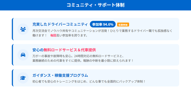 勤務時間詳細 【業務イメージ】 ※業務委託のため、あくまで一例です! ▶ 稼働時間目安:9:00〜20:00 ▶ 配送の合間に、自身のタイミングで休憩は確保できます。 ________________ ⏰ある1日の流れ(例)  ̄ ̄ ̄ ̄ ̄ ̄ ̄ ̄ ̄ ̄ ̄ ̄ ̄ ̄ ̄ ̄ 9:00 到着&積込→15分で出発可能 荷物は一人前をカートに仕分け済。 また、配達エリア毎にバッグに集約済。 「バッグ6~7個と、バラ荷物を10個前後」 でシンプルに積込み終了! 配達ルートも自動でナビ表示 9:30 午前の配送開始 積込み完了後、センターを出発します 13~14:00前後 午前中の配送終了 休憩時間は自分で決められます 午後スタートの15時までゆっくり休憩 15:00 午後の配送開始 9:00と同様に積込み15分でスムーズに出発 19:00~21:00 配達終了 終わり次第配送エリアから直帰OK! 【稼働までの流れ】 ■ STEP1:横乗り研修(2日間)  ̄ ̄ ̄ ̄ ̄ ̄ ̄ ̄ ̄ ̄ ̄ ̄ ̄ ̄ ̄ ドライバーと一緒にまわりながら、 仕事の流れを学びます。 ※1日あたり7,000円の報酬あり ■ STEP2:ガイダンス期間(10日間)  ̄ ̄ ̄ ̄ ̄ ̄ ̄ ̄ ̄ ̄ ̄ ̄ ̄ ̄ ̄ ̄ ̄ ̄ 最初のうちは、配送個数を段階的に調整 1~5日目:60~70%の荷量 6~10日目:70~80%の荷量 自分のペースで慣れていける環境です。 ■ STEP3:11日目以降は通常稼働!  ̄ ̄ ̄ ̄ ̄ ̄ ̄ ̄ ̄ ̄ ̄ ̄ ̄ ̄ ̄ ̄ ̄ ̄ 業務の流れがしっかり身についた状態で、 本格的な配送に移行します。