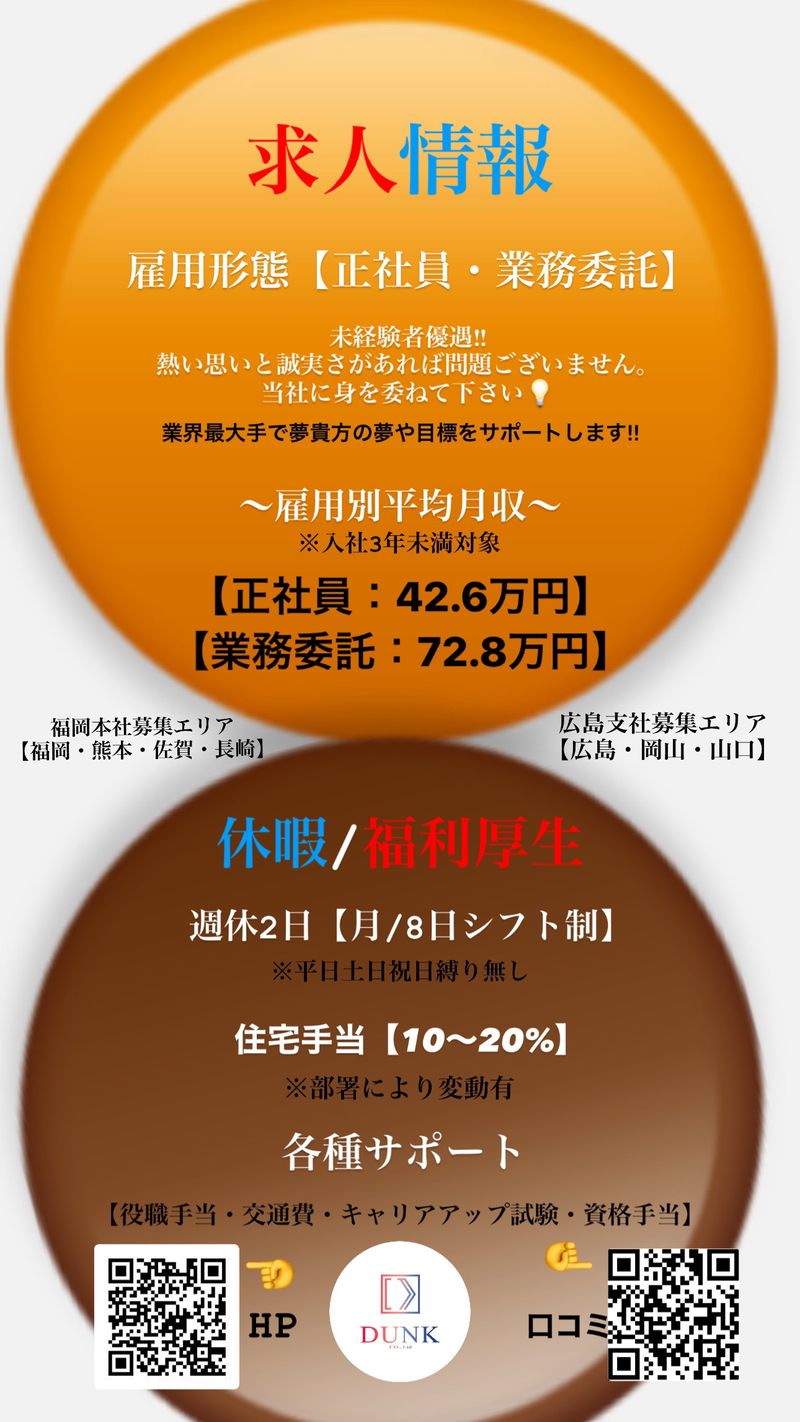 仕事内容: dunk-official.com ←ホームページ 報酬例】 売上500万円、報酬%20%=100万円が所得となります。 上記は平均的な金額となります。 必要な初期材は全て会社から貸付が可能です! 充分な研修制度、フォロー体制が整っております。 ご依頼先に訪問し、修繕・リフォームのご提案をするお仕事になります。 大掛かりなリフォームや工事は当社専属の工事部が施工しますので重労働はありません。 アットホームで楽しい環境だと自信をもってお伝えします!長くお仕事を通して、立場や所得を掴んで行く為に全力でサポート致します。 営業未経験・現場未経験 大歓迎◎ 運転免許(AT可) 所持 稼ぎたい動機や目標がある人 誠実に会社の人やお客様と向き合える人 真面目に成長を怠らない人