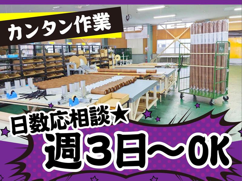 仕事内容 =================== ★平日のみのお仕事! ★お仕事は13時or15時終わり! ★子育てとの両立◎ ★Wワーク・副業OK!家事との両立◎ ★30~50代の女性スタッフ多数活躍中! =================== 《コツコツ作業でやりがい充実!》 大手ホームセンター様向けインテリア商品(ラグマット)を扱います。 ホームセンターの売り場に並び、お客様の手に渡るやりがいを感じられます! 主なお仕事は原反の裁断加工や包装業務になります。 熟練スタッフが丁寧に教えてくれます! 《お仕事内容》 ・材料の裁断時のサポート ・商品巻き付け ・包装作業 上記の業務をお任せします! ☆大きい商品は2人で作業します! ☆入社後はしっかりサポートするので未経験も安心! 《しっかりリフレッシュ♪》 当社は、従業員の家庭、休みを特に大事にしています! 残業も特別な理由が無い限りありません。 仕事もプライベートも充実させながら、 自分らしい生活を送りたい方にぴったりな仕事です。 子育て中のママも活躍しております。 《ご応募お待ちしています!》 未経験からスタートスタッフがほとんど! 真面目に仕事に取り組む姿勢で、ゆっくりでも構いません。 丁寧に仕事を覚えていきましょう! 仲間と協力しながら、一緒に仕事をしていける方、お待ちしています♪