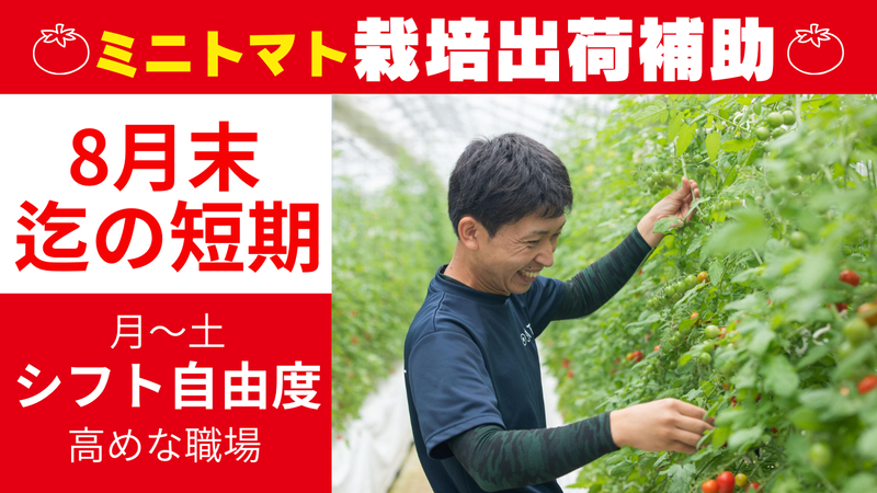 仕事内容 メディアでも多く取り上げられている有名『高糖度ミニトマト』の栽培や出荷に携われるお仕事です。 はじめての方でも簡単にできる作業ばかりなので安心してご応募ください。 随時~8月末までの期間限定のお仕事になります★入社時期は相談可能です。 栽培部門 ▶環境制御型ビニールハウス内での作業。 ・収穫・ハウスの掃除 ・管理作業/葉かき、誘引、追肥、定植など 出荷部門 ▶冷房完備の倉庫内での作業 ・パックや段ボール詰め ・出荷資材準備・トマトの選別 基本的にはすべて立ち仕事です。 ハウスの中では脚立の上り下り、5㎏程度の トマトコンテナをもって運ぶ作業も発生します。