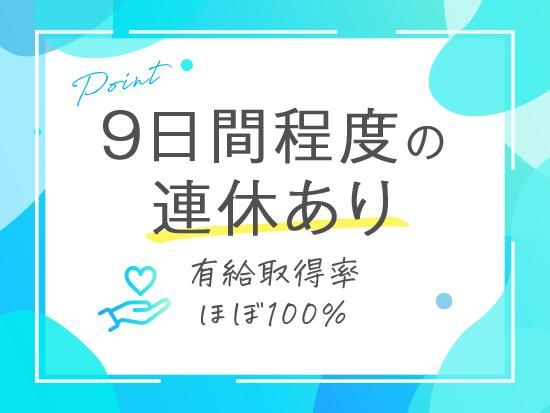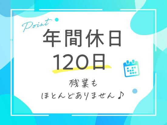 休日休暇 <年間休日120日> ■完全週休2日制(日・月) ■年末年始休暇 ■夏季休暇 ■GW休暇 ■産前産後休業(取得・復職実績あり) ■育児休業(取得・復職実績あり) ■有給休暇(時間休取得可能) ■慶弔休暇 ■特別休暇 ※年末年始休暇、夏季休暇、GW休暇は例年9日程度です。