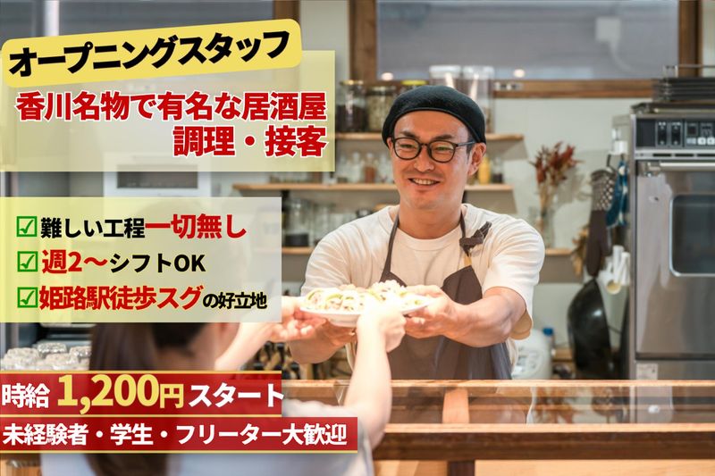 仕事内容 ✅ オープニングスタッフの募集! ✅ 週2日〜シフト相談OK ✅ 姫路駅周辺で通勤しやすい立地 ✅ 未経験OK/調理・接客どちらも経験できる ✅ 時給1,200円スタート/随時昇給有り 【具体的な仕事内容】 香川の名物の骨付鳥メインの居酒屋にて、調理・接客業務をお願いします! ■ 主な業務内容 ・骨付鳥を中心とした調理・盛り付け ・ホールでの接客対応や簡単な調理 ・お客様とのコミュニケーション など オープニングスタッフのため、全員が同じスタート。 未経験の方でも、基本からしっかりお教えしますのでご安心ください! 【こんな方にぴったり】 • 飲食店で働いてみたい • 香川名物・骨付鳥に興味がある • 新しいお店を立ち上げる経験をしてみたい • 人と話すことが好き • 仲間と楽しく働きたい 【お店のアピールポイント】 2026年3月、姫路駅前に新規オープン!香川名物であり「日本でしか食べられない」絶品の骨付鳥をメインに提供する活気あふれる居酒屋です。スパイシーな骨付鳥から溢れる肉汁と鶏油(チーユ)は、おにぎりと一緒に食べると中毒になること間違いなし!さらに、余った旨みたっぷりの鶏油を〆のラーメンに入れれば旨みが倍増します。国内外のお客様に「日本の旨み」を存分に味わっていただく、ワクワクするようなお食事体験を提供しませんか?スタートが同じ同期がたくさんいるオープニングスタッフとして、一緒にお店を盛り上げてくれる方を大募集しています!