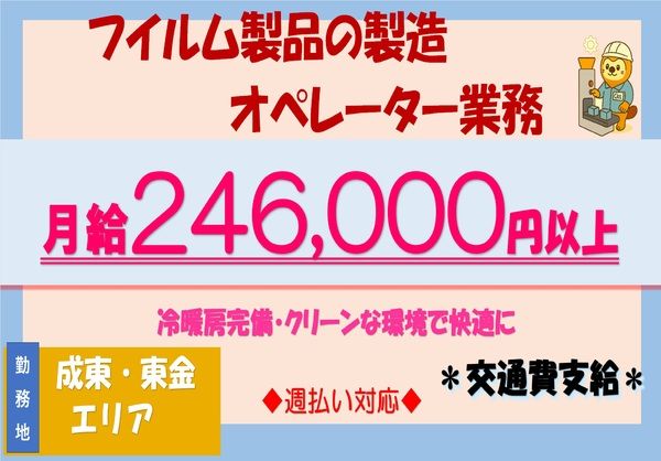 仕事内容 パレット移動作業、製品梱包、原料準備、原料投入、 原料袋の片付け、機械操作補助、外観検査作業など 原料は25キロ紙帯が主に取り扱い台車で移動作業や原料をタンクに投入作業 \\ この求人のココがおすすめ // ✎ 土日祝休みの完全週休2日制! 夏季や年末年始は大型連休です。 年間カレンダーがあるので、予定が立てやすい! ✎ 未経験・ブランクのある方、大歓迎! 学歴・経験不問!特別なスキルも不要! ほとんどのスタッフが未経験スタート! 既存スタッフが優しくレクチャーしますのでご安心ください◎ もっと安定して働きたいという方には正社員登用あり! ✎ 給与週払い制度あり 急な出費にも対応できるのが嬉しい♪ もちろん月払いもOK! 17時半退社×残業ほぼなしで月収22万円以上可能◎ ✎ リモート登録実施中&即日・当日登録OK 応募したその日に来社不要で登録完了♪ スグに働きたいという方必見!! 職場見学もあるのでご安心ください◎ ◆教育システム 入社時の教育システムが確立されており、入社後も定期的に実施されております。 入社後は教育担当者が必ず一人つきますので、不安なく業務に専念できる環境です。 慣れてきたら… 設備や機械のメンテナンスなども現場OJTを通じて学べます。 様々な現場で通用するスキルを学べるって凄いですよね! ◆仕事の流れ 一日の仕事の流れはシンプルです。 入社後は与えられたポジションでしっかりと見て触って基本を学んで頂きます。 焦らず自分の仕事に没頭できるため自分のペースで覚えていけます。 研修制度や資格取得制度もあり、スキルアップを図れる職場です。 スキルアップ向上に伴いポジションの異動や業務の変更なども可能です。 ◆休憩時間 休憩は必ず取って頂きます。どんなに忙しくても取ってくださいね。 お昼休憩のランチタイムは食堂があるのでお店で出てくるような食事が出てきます! 例えば…とんかつ定食や生姜焼き定食などなど・・・ ガッツリいきたい方には最高ですね♪ ◆ 業界未経験者大歓迎 ◆  ̄ ̄ ̄ ̄ ̄ ̄ ̄ ̄ ̄ ̄ ̄ ̄ ̄ 以下の業界での勤務経験のある方も活躍中! ・自動車整備業界 ・物流・運輸業界 ・飲食業界 ・小売業界 ・サービス業界 ・アミューズメント業界 ・インフラ業界 ・ホテル業界 etc.