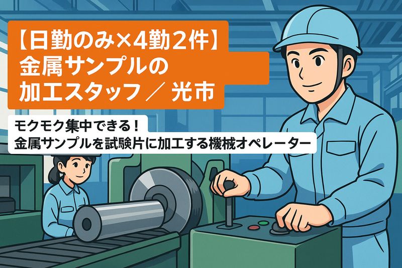 【仕事内容】 光市島田の工場にて、金属製品の品質管理工程に関わる「試験片の加工」を担当していただきます。工場から届いた金属サンプルを、専用の機械を使って試験用の形状に加工するお仕事です。 機械操作が中心のため、集中してコツコツ取り組むことが得意な方にぴったり。シンプルな作業中心で、未経験でも安心してスタートできます。 【おすすめPoint】 ・冷暖房完備で一年中快適に働ける ・丁寧な研修で段階的に仕事に慣れていける ・力仕事少なめ!女性も無理なく続けられる環境 【お仕事の流れ】 ・工場から届く金属サンプルの受け入れ ・専用機械を使用して試験片に加工(切断・削り) ・加工後の仕上げ(バリ取り・軽いハンマー作業) ==================== 生活リズムも、心の余白も守れる仕事。 ==================== 日勤のみ・一定サイクルの勤務だから、生活リズムを崩さずに働けます。対人ストレスが少ないモクモク作業で、集中して取り組める環境です。 働きながら新しいことを覚えていけるため、これまで製造経験のない方のスタートにも最適。冷暖房完備で体力的な負担も少なく、無理なく安定して続けやすい職場です。 ==================== 経験ゼロから安定収入を実現できます! ==================== 月収20万円以上を安定して目指せる環境です。特別な資格や経験がなくても、手順通りの作業で毎月しっかり収入が積み上がっていきます。 生活費を自分の力でまかなえるようになりたい方や、将来に向けてまずは安定した土台をつくりたい方にぴったりの働き方です。 無理なく続けながら収入を積み上げていけるため、未経験からの再スタートにも最適です。 【管理番号:Y23195】 【求人ID-PKY01】