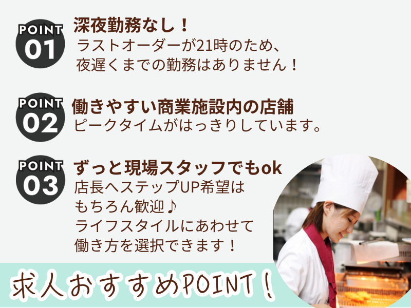 仕事内容 \男女ともに活躍中!「無理なく適度」に働ける/ ✅深夜勤務なし(ラストオーダー21時) ✅1日平均8hで残業ほとんどなし ✅賞与年2回+決算賞与 ✅通勤交通費全額支給 ✅転居を伴う転勤なし ✅調理補助からスタートで安心 ✅マニュアル完備&効率化を推進 当店では、 飲食業界の「ハードそう」というイメージを払拭! タッチパネル注文導入など効率化が進み、 体力的な負担を軽減しています。 仕事はもちろん、 プライベートの時間も充実できるような 働き方を目指している方にピッタリです。 困った時は役員も助ける人情味ある社風が自慢です。 また、特定技能資格をお持ちの方も応募可能です。 ※日本語能力試験N1相当の日本語力が必要となります。 【具体的なお仕事】 接客・調理などをお願いします。 ◆お客様の案内・配膳 ◆お肉のカットや仕込み ◆料理の盛り付け ◆レジ対応 など 入社後は盛りつけなどカンタンな 調理補助からスタートしましょう。 徐々に各メニューの調理や ホール業務のサポート、 店舗運営の流れを覚えて頂きます。 タッチパネル注文も導入され、 仕入れなども取引先とシステム連携 されているなど効率化が進んでおり、 難しさはありません。もちろん マニュアルも完備されています。 この仕事のPOINT・・━━・・━━・・━━・・ ✨早番・遅番などシフト交代 ・・━━・・━━・・━━・・━━・・━━・・━ 1日勤務は平均8h程(変形労働時間) またラストオーダーは20時30分、 21時閉店なので 遅番でも深夜勤務もないため、 無理なく適度に働けます! この仕事のPOINT・・━━・・━━・・━━・・ ✨働きやすい商業施設内の店舗 ・・━━・・━━・・━━・・━━・・━━・・━ お客様はファミリーから お年寄りまで幅広く、 お食事中心なので 11:30~13:30のお昼どき 18:00~20:00の夕食どき ピークタイムがはっきりと しているのも特徴です。 それ以外の時間は比較的落ち着いて 翌日以降の準備や後片付けをしたり、 順番に休憩を取ったりしています。 この仕事のPOINT・・━━・・━━・・━━・・ ✨ずっと現場スタッフでもok ・・━━・・━━・・━━・・━━・・━━・・━ 店長へステップUP希望はもちろん歓迎ですが 責任あるポストは不安って方は ずっと飲食店現場でホール・キッチンでもok ライフスタイルにあわせて働き方を 本人が選択できます。 この会社のPOINT・・━━・・━━・・━━・・ ✨長く安心して働ける会社 ・・━━・・━━・・━━・・━━・・━━・・━ とんかつ、ラーメン、中華、お好み焼き、 カフェのほか最近では冷凍食品まで。 景気や社会情勢に左右されない多彩な 業態で店舗を拡大。 70店舗、従業員1800名の安定企業! この会社のPOINT・・━━・・━━・・━━・・ ✨きらくの正社員を選んで良かった! ・・━━・・━━・・━━・・━━・・━━・・━ 貴方にそう言ってもらえるように、 ライフステージが変わっても、安心して 働ける環境がある飲食店でありたいと 思っています。 仕事はもちろん、プライベートの時間も 充実できるような働き方を目指している方に ピッタリの職場です。 お話を聞くだけでも構いませんので、 お気軽にご応募お待ちしています!