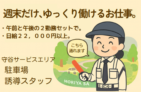 仕事内容 ━━━━\\レア案件×高収入//━━━━ \守谷SA 駐車場 誘導スタッフ募集/ ―――――――――――――――――― ★土日祝・大型連休だけの勤務OK★ 午前+午後の“2現場セット勤務”で日給2.2万円超! 「学業や本業がない日に集中して稼ぎたい」 そんな働き方にぴったりです◎ ━━━━━━━━━━━━━━━━━━━ 【仕事内容】 守谷サービスエリアの駐車場にて、来場者の安全な通行をサポートしていただきます。 「こちら通れます」「お気をつけてお進みください」などの声かけとともに、車両や歩行者の流れを安全に保つ業務です。 ▶ 午前(下り)・午後(上り)の2現場連勤で1日しっかり勤務。 →「体を動かすのが好き」「集中して働きたい」という方にぴったり! 混雑時もチームで声を掛け合いながら対応するため、未経験の方も安心してスタートできます。 【スタッフの声】 ▶ 「1日10時間って大変かな…と思ってたけど」 → 午前と午後でメリハリがあるので、思っていたより早く感じます! (30代/フリーター) ▶ 「警備ってちょっと堅いイメージがあったけど…」 → 実際は声かけや誘導など“人と関わる”あたたかい仕事でした。 (20代/学生) ▶ 「副業で探してたけど、土日だけでこれだけ稼げるのはレアでした」 → 週1〜2日でも、1回で2万円以上はありがたいです! (30代/会社員) ▶ 「混雑したときどうなるんだろうって心配だったけど」 → チームで分担して動けるので、自分1人で抱えることはありません◎ (40代/主婦) 週末や連休だけの“集中シフト”で、しっかり稼ぎながら人の役に立つ仕事。 あなたも、守谷SAを一緒に支える仲間になりませんか?