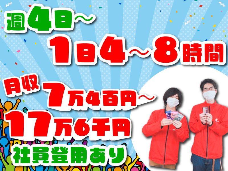 仕事内容 ー☆晴れる屋が長野に新店オープン!!☆ー 新しいお店を一緒に盛り上げてくれる オープニングスタッフを大募集!! ▷お店の立ち上げにイチから携われる! ▷みんなと一緒のスタートで安心! ▷お店と一緒に成長していける! この楽しみは”オープニング”ならでは!! カードゲーム経験者はもちろん、 未経験の方も大歓迎!! 人気カードゲームショップ「晴れる屋」で ”好き”や”楽しい”を仕事にしませんか? +*・*☆・.+*+ 「晴れる屋 長野店」にて接客を中心に 店舗運営の業務まで幅広くお任せします。 【具体的な業務】 □レジやカード販売などの接客 □買い取ったカードの整理整頓・商品化 □デッキケースなどサプライ商品の品出し □独自システムを用いた査定・買取対応 □簡単なPOP作成などのバック業務 □バトル大会などのイベント運営 □イベントの企画・提案 +*・*☆・.+*+ \未経験でも安心の環境が整ってます!/ ☆Point|独自のマニュアル完備で安心! 業務はOJT研修を通して丁寧に教えます! はじめは軽作業など簡単な業務から スタートし、徐々にできることを増やして いきましょう! マニュアルもあるので困ったことが あってもスグに確認できます! フォロー体制も整っていて、 未経験にやさしい職場環境です♪ ▽ ▽ ▽ \ 1分で完了!気になったら応募を / ●「応募画面へ進む」をクリック ●名前など必須項目を入力 ●応募完了! ………………………………………………… ◇応募⇒面接⇒採用 ◇スピード選考実施中! ★応募後に届くメールに面接希望日をご返信ください! …………………………………………………