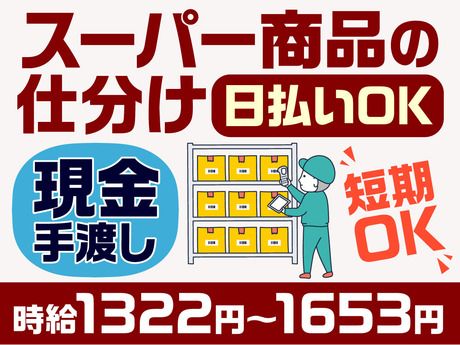 仕事内容 スーパー商品の仕分け /////////////////////////////////////// (σ'u')σ【全額日払い・現金手渡しOK】 スグに働きたい方にもピッタリ◎ /////////////////////////////////////// ◎商品を積み込む作業はありません!! ◎体力的な負担少なめ! ◎未経験の方でもすぐに覚えられるシンプルな作業です。 スーパー商品の仕分けをお任せ! (ダンボールに入った野菜、調味料、デザートなど) ■カゴ車に入っている商品を指定された番号のカゴ車に移動! ※カゴ車には番号が貼られているので、指定の番号を確認しながら移動させるダケ! 超!カンタン軽作業! 丁寧な研修とサポート体制あり! 安心して働ける環境です♪ コツコツ作業が得意な方にオススメ☆ アピールポイント ===== ★<POINT>★ ===== ■全額日払い・現金手渡しOK(規定あり) ■単発・短期~長期まで自由自在! ■派遣デビューの方も大歓迎♪ ■未経験・お仕事ブランクOK ■履歴書・来社不要で登録可能♪ ■シフトはスマホから申請楽々! ■初勤務手当支給有り ================== あなたの理想の働き方をご相談ください♪ 「平日だけ働きたい」 「Wワークで土日だけ」 「子どものお迎えまでの時間がいい」 「効率よく稼げる夜勤がいい」 「長期休暇中だけフル勤務したい」など どんなご希望も相談OK! プライベートも大切にできる働き方を一緒に探しましょう! 「応募する」ボタンから、 お気軽にお問い合わせください☆彡 登録までの流れをご紹介 ┏━━━━━━━━━━┓ たったコレだけでOK! ┗━━━━━━━━━━┛ (1)『応募する』ボタンをタップ!*24時間OK! (2)メール記載のURLより登録会の予約をお願いします! (3)面談でしっかりご説明します!これで登録完了♪ ☆お友達との応募も大歓迎! ☆紹介可能案件数は業界TOPクラス! まずはかんたん登録♪ WEB面談OK◎ オンラインだけでは不安な方は、来社登録会も実施中です!