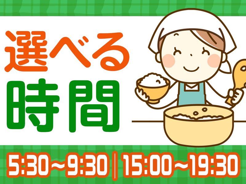 仕事内容 ▼スキル不要!カンタン調理補助  ̄ ̄ ̄ ̄ ̄ ̄ ̄ ̄ ̄ ̄ ̄ ̄ ̄ ̄ ̄ ̄ 週2日~&短時間勤務で スキマ時間を活かせる◎ ⭐火を使った調理はなし! ⭐スキル不要&未経験歓迎 ⭐配膳までで◎介助業務なし! ⭐主婦(夫)・シニア世代活躍中 ⭐早朝からor午後からの選べる時間帯 ⭐夏と冬に嬉しいプチボーナスあり 特別養護老人ホームでの 簡単な調理作業をお任せします◎ - 仕事内容 - 食事の盛付、入居様に合わせて おかずを一口サイズにカット ※補助業務がメイン ▼ 盛り付けた食事をセット ▼ フロアにお届け ▼ お食事後の食器回収、洗浄、簡単な片付け ★一度の食数は約100食ほどです。 ★フロアに食事を届けた以降は、施設の職員さんへバトンタッチ♪ なので、お食事の介助はありません!! ✅未経験・ブランクOK!  ̄ ̄ ̄ ̄ ̄ ̄ ̄ ̄ ̄ ̄ ̄ ̄ お料理が得意でなくても大丈夫! 調理の補助が中心なので安心♪ わからないことがあっても 先輩スタッフが丁寧にフォローします! あたたかい職場で、無理なく長く働ける環境が整っています。 ご入居者様が安心・安全な生活を送れるよう にサポートするやりがいのある仕事です★ ✅選べる2つの勤務時間帯  ̄ ̄ ̄ ̄ ̄ ̄ ̄ ̄ ̄ ̄ ̄ ̄ ̄ ◆早朝(5:30~9:30/実働3.75h) ◆午後(15:00~19:30/実働4.5h) → 短時間勤務OK!ご都合に合わせて働けます! ライフスタイルに合わせて選択OK! 「朝の時間を有効活用したい」 「午後はプライベートの時間にしたい」 「家事や用事を済ませて午後から出勤したい」という方も◎ 自分らしい働き方を選べます♪ / こんな働き方が叶います♪ \ ★お子さまの送迎時間に合わせて ★Wワーク・副業のスキマ時間に ★体力的に無理のない短時間勤務で あなたの生活リズムに合わせて、無理なく働ける環境です♪ ⭐経験・スキル不問!人柄重視で積極採用中 志望動機は何でもOK! 「家から近い」「時間帯が合っている」「無理なく働きたい」など、 きっかけはどんな理由でも大歓迎です! 経験やスキルよりも、人柄を大切にした採用を行っています。 未経験の方やブランクのある方も、安心してご応募ください。 現在、積極採用中のため、たくさんの方とお会いしたいと考えています◎