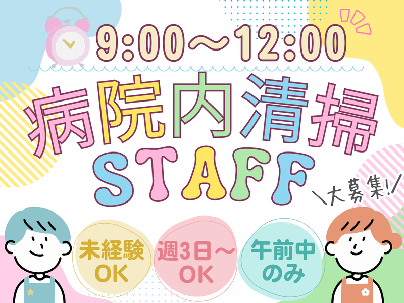 仕事内容 ⸜⸜ ⸜⸜ ✦病棟内を快適に保つ✦ ⸝⸝ ⸝⸝ 。✨ フロアキーパーを募集します!! ✨。 -・-・-・-・-・-・-・-・-・-・-・-・-・-・-・-・-・-・-・-・-・- ✅清掃未経験歓迎◎丁寧なサポート体制有 ✅週3日~OK!午前の3時間のみ♪ ✅毎年4月に昇給制度で時給UP◎ ✅長期安定勤務も叶う!正社員登用あり★ ✅お得に東急ハーヴェストの利用できる◎ ✅ラクラク通勤!車通勤可&駐車場完備! -・-・-・-・-・-・-・-・-・-・-・-・-・-・-・-・-・-・-・-・-・- ⏩お仕事内容  ̄ ̄ ̄ ̄ ̄ ̄ ̄ ̄ 病棟内の床清掃などの清掃をお任せ! ★患者さんやスタッフが 気持ちよく過ごせるように、 きれいな空間を保ちましょう◎ ★特別な資格や経験は不要! 未経験からスタートしたスタッフも 多数活躍中です♪ ✧・┈┈┈┈┈ ・✧✧・┈┈┈┈┈ ・✧ ⛲安心の丁寧サポートあり!  ̄ ̄ ̄ ̄ ̄ ̄ ̄ ̄ ̄ ̄ ̄ ̄ ̄ ̄ 業務は先輩スタッフが 丁寧にレクチャーします! 慣れるまではしっかりサポート していくので分からない事や 不安な事などはどんどん先輩を 頼ってください! ⛲職場環境について!  ̄ ̄ ̄ ̄ ̄ ̄ ̄ ̄ ̄ ̄ ̄ ̄ 清潔で明るい病棟内で、 チームワークを大切にしながら働けます! 週3日~&9:00~12:00の3時間⏰ 無理のない勤務ペースで、 安定した収入とやりがいを 感じられる環境です☺ ✧・┈┈┈┈┈ ・✧✧・┈┈┈┈┈ ・✧