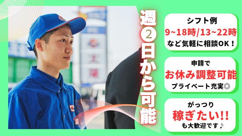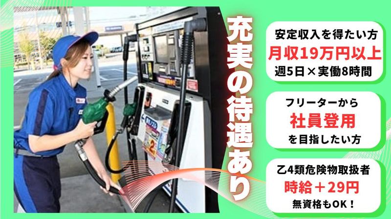 仕事内容 【仕事内容詳細】 お客様へのセルフ給油等の説明や、 店内の掃除を中心にお願いします! ✅給油経験がなくても、説明ができれば◎ ✅ほとんどの方が未経験スタート‼ 週2日~!シフト自由◎ 半年に1度昇給制度があり時給もアップ♪ 乙4資格ある方は時給+29円★ 学生やフリーターが多数活躍中! お客様とやり取りする機会があるので 「ありがとう」と直接言っていただける ことがありやりがいを持って取り組めます♪ 常連のお客様もたくさんいらっしゃるので 接客もしやすいですよ❀ 「体を動かすことが好き」といった方にも オススメ♪しっかりサポートするので、 わからないことがあれば 何でも聞いてくださいね✨ 10~40代と幅広く活躍中˖✧◝(・◡・)◜✧˖ 完全セルフなので、 未経験でも安心してスタートできます♪ スキルチェックシートがあり、 できるようになったことにチェック!! 半年に1度評価のタイミングがあり、 クリアしていると時給アップ★ 今までの経験は一切不問! 人柄を重視した採用を行っています☆ 現在働いているスタッフも 未経験スタートが8割以上! 皆さんイキイキと活躍中です! 当社では「学生」「フリーター」 など様々な方が自分の ライフスタイルに合わせて働いています♪ 一人一人のライフスタイルがあり、 志望動機も十人十色。 「未経験から活躍できる職場を探している」 「私生活も大切にできる環境が良い」 など。 日祝のみの出勤もOKです! ガッツリ稼ぎたい方は大歓迎です♪ 友達同士の応募OK❣ ✧❇✿✧❇✿✧❇✿✧❇✿✧❇✿✧❇✿✧