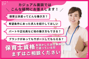 応募資格 保育士資格 ■40代~50代の女性活躍中! ■保育士資格をお持ちの方活躍 ■ブランクOK 資格があればOK! 経験年数は問いませんので、 自信がない方はお気軽にご相談からでも◎ 介護・家庭と両立したい方もご相談ください